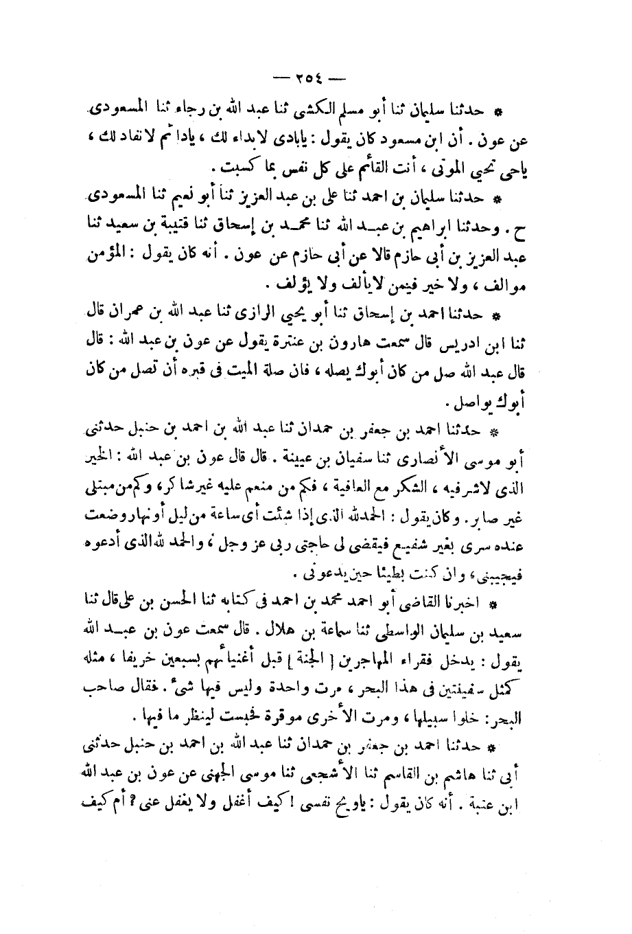 حَدَّثَنَا أَحْمَدُ بْنُ جَعْفَرِ بْنِ حَمْدَانَ، ثَنَا عَبْدُ اللهِ بْنُ أَحْمَدَ بْنِ حَنْبَلٍ، حَدَّثَنِي أَبِي، ثَنَا هَاشِمُ بْنُ الْقَاسِمِ، ثَنَا الْأَشْجَعِيُّ، ثَنَا مُوسَى الْجُهَنِيُّ، عَنْ عَوْنِ بْنِ عَبْدِ اللهِ بْنِ عُتْبَةَ، أَنَّهُ كَانَ يَقُولُ: «يَا وَيْحَ نَفْسِي، §كَيْفَ أَغْفَلُ وَلَا يُغْفَلُ عَنِّي أَمْ كَيْفَ -[255]- تَهْنَؤُنِي مَعِيشَتِي وَالْيَوْمُ الثَّقِيلُ وَرَائِي أَمْ كَيْفَ يَشْتَدُّ عَجَبِي بِدَارٍ فِي غَيْرِهَا قَرَارِي وَخُلْدِي»