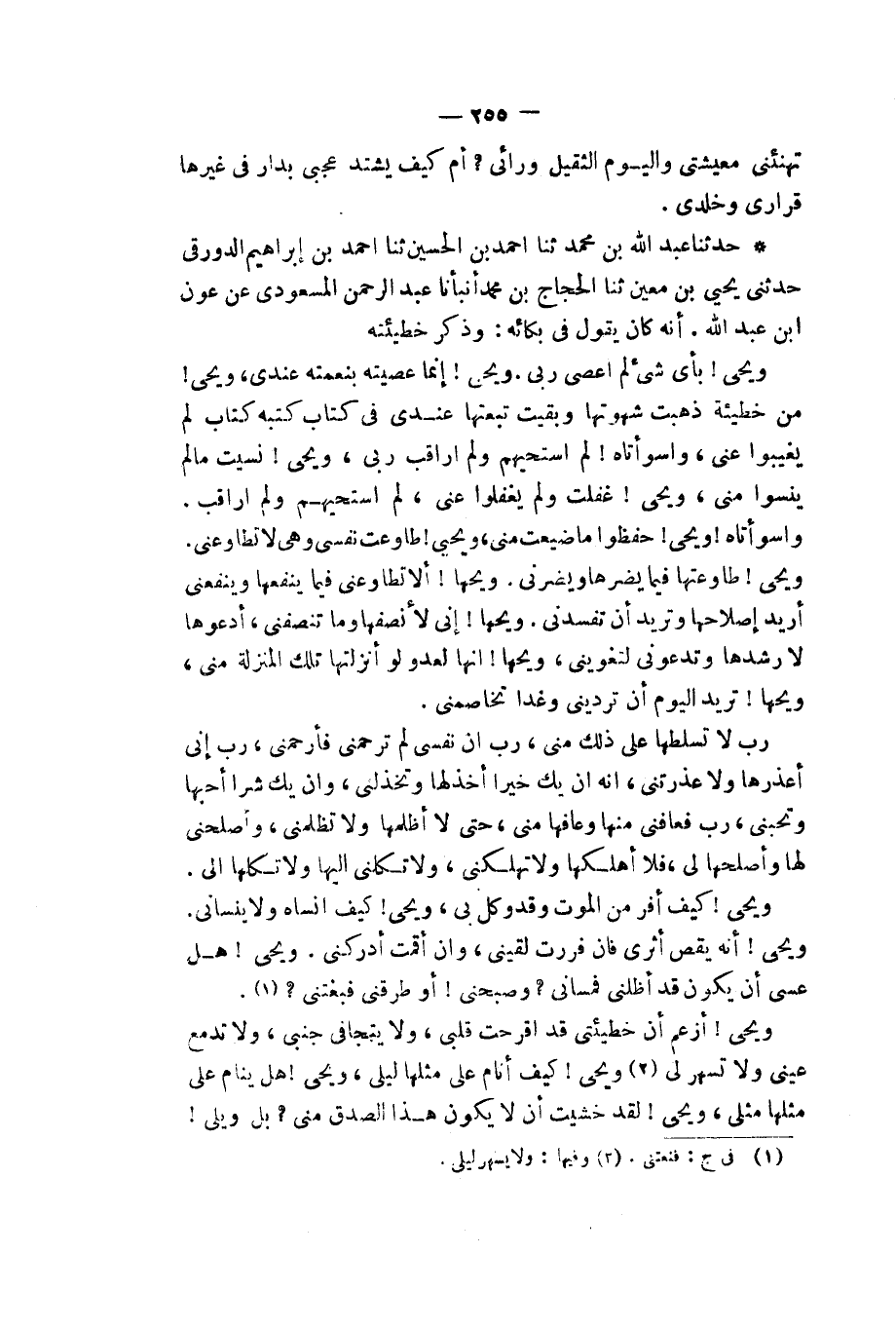 حَدَّثَنَا عَبْدُ اللهِ بْنُ مُحَمَّدٍ، ثَنَا أَحْمَدُ بْنُ الْحُسَيْنِ، ثَنَا أَحْمَدُ بْنُ إِبْرَاهِيمَ الدَّوْرَقِيُّ، حَدَّثَنِي يَحْيَى بْنُ مَعِينٍ، ثَنَا الْحَجَّاجُ بْنُ مُحَمَّدٍ، أَنْبَأَنَا عَبْدُ الرَّحْمَنِ الْمَسْعُودِيُّ، عَنْ عَوْنِ بْنِ عَبْدِ اللهِ، أَنَّهُ كَانَ يَقُولُ فِي بُكَائِهِ وَذَكَرَ خَطِيئَتَهُ: «§وَيْحِي بِأَيِّ شَيْءٍ لَمْ أَعْصِ رَبِّي، وَيْحِي إِنَّمَا عَصَيْتُهُ بِنِعْمَتِهِ عِنْدِي، وَيْحِي مِنْ خَطِيئَةٍ ذَهَبَتْ شَهْوَتُهَا، وَبَقِيَتْ تَبِعَتُهَا عِنْدِي، فِي كِتَابٍ كَتَبَهُ كُتَّابٌ لَمْ يَغِيبُوا عَنِّي، وَاسَوْأَتَاهُ لَمْ أَسْتَحْيِهِمْ، وَلَمْ أُرَاقِبْ رَبِّي، وَيْحِي نَسِيتُ مَا لَمْ يَنْسَوْا مِنِّي، وَيْحِي غَفَلْتُ وَلَمْ يَغْفُلُوا عَنِّي، وَلَمْ أَسْتَحْيِهِمْ، وَلَمْ أُرَاقِبْ، وَاسَوْأَتَاهُ، وَيْحِي، حَفِظُوا مَا ضَيَّعْتُ مِنِّي، وَيْحِي طَاوَعْتُ نَفْسِي وَهِيَ لَا تُطَاوِعْنِي، وَيْحِي، طَاوَعْتُهَا فِيمَا يَضُرُّهَا وَيَضُرُّنِي، وَيْحَهَا أَلَا تُطَاوِعُنِي فِيمَا يَنْفَعُهَا وَيَنْفَعُنِي، أُرِيدُ إِصْلَاحَهَا وَتُرِيدُ أَنْ تُفْسِدَنِي، وَيْحَهَا إِنِّي لَأُنْصِفُهَا وَمَا تُنْصِفُنِي، أَدْعُوهَا لِأُرْشِدَهَا وَتَدْعُونِي لِتُغْوِيَنِي، وَيْحَهَا إِنَّهَا لَعَدُوٌّ لَوْ أَنْزَلْتُهُ تِلْكَ الْمَنْزِلَةِ مِنِّي، وَيْحَهَا تُرِيدُ الْيَوْمَ أَنْ تُرْدِيَنِي وَغَدًا تُخَاصِمَنِي. رَبِّ لَا تُسَلِّطْهَا عَلَى ذَلِكَ مِنِّي، رَبِّ إِنَّ نَفْسِيَ لَمْ تَرْحَمْنِي فَارْحَمْنِي، رَبِّ إِنِّي أَعْذُرُهَا وَلَا تَعْذُرُنِي، إِنَّهُ إِنْ يَكُ خَيْرًا أَخْذُلْهَا وَتَخْذُلْنِي، وَإِنْ يَكُ شَرًّا أُحِبُّهَا وَتُحِبُّنِي، رَبِّ فَعَافِنِي مِنْهَا وَعَافِهَا مِنِّي حَتَّى لَا أَظْلِمَهَا وَلَا تَظْلِمَنِي، وَأَصْلِحْنِي لَهَا وَأَصْلِحْهَا لِي، فَلَا أُهْلِكُهَا وَلَا تُهْلِكُنِي، وَلَا تَكِلْنِي إِلَيْهَا وَلَا تَكِلْهَا إِلَيَّ. وَيْحِي كَيْفَ أَفِرُّ مِنَ الْمَوْتِ وَقَدْ وُكِّلَ بِي؟ وَيْحِي كَيْفَ أَنْسَاهُ وَلَا يَنْسَانِي؟ وَيْحِي إِنَّهُ يَقُصُّ أَثَرِي، فَإِنْ فَرَرْتُ لَقِيَنِي، وَإِنْ أَقَمْتُ أَدْرَكَنِي. وَيْحِي هَلْ عَسَى أَنْ يَكُونَ قَدْ أَظَلَّنِي فَمَسَّانِي وَصَبَّحَنِي أَوْ طَرَقَنِي فَبَغَتَنِي، وَيْحِي أَزْعُمُ أَنَّ خَطِيئَتِيَ قَدِ أَقْرَحَتْ قَلْبِي وَلَا يَتَجَافَى جَنْبِي، وَلَا تَدْمَعُ عَيْنِي، وَلَا تَسْهَرُ لِي، وَيْحِي كَيْفَ أَنَامُ عَلَى مِثْلِهَا لِيَلِي، وَيْحِي هَلْ يَنَامُ عَلَى مِثْلِهَا مِثْلِي؟ وَيْحِي لَقَدْ خَشِيتُ أَنْ لَا يَكُونَ هَذَا الصِّدْقُ مِنِّي، بَلْ وَيْلِي -[256]- إِنْ لَمْ يَرْحَمْنِي رَبِّي. وَيْحِي كَيْفَ لَا تُوهَنُ قُوَّتِي، وَلَا تَعْطَشُ هَامَتِي؟ بَلْ وَيْلِي إِنْ لَمْ يَرْحَمْنِي رَبِّي، وَيْحِي كَيْفَ لَا أَنْشَطُ فِيمَا يُطْفِئُهَا عَنِّي، بَلْ وَيْلِي إِنْ لَمْ يَرْحَمْنِي رَبِّي، وَيْحِي كَيْفَ لَا يُذْهِبُ ذِكْرُ خَطِيئَتِي كَسَلِي، وَلَا يَبْعَثُنِي إِلَى مَا يُذْهِبُهَا عَنِّي؟ بَلْ وَيْلِي إِنْ لَمْ يَرْحَمْنِي رَبِّي، وَيْحِي كَيْفَ تَنْكَأَ قَرْحَتِي مَا تَكْسِبُ يَدِي، وَيْحَ نَفْسِي، بَلْ وَيْلِي إِنْ لَمْ يَرْحَمْنِي رَبِّي، وَيْحِي أَلَا تَنْهَانِي الْأُولَى مِنْ خَطِيئَتِي عَنِ الْآخِرَةِ، وَلَا تُذَكِّرُنِي الْآخِرَةُ مِنْ خَطِيئَتِي بِسُوءِ مَا رَكِبْتُ مِنَ الْأُولَى فَوَيْلِي ثُمَّ وَيْلِي إِنْ لَمْ يتِمَّ عَفُوُّ رَبِّي، وَيْحِي لَقَدْ كَانَ لِي فِيمَا اسْتَوْعَبْتُ مِنْ لِسَانِي وَسَمْعِي وَقَلْبِي وَبَصَرِي اشْتِغَالٌ، فَوَيْلٌ لِي إِنْ لَمْ يَرْحَمْنِي رَبِّي، وَيْحِي إِنْ حُجِبْتُ يَوْمَ الْقِيَامَةِ عَن