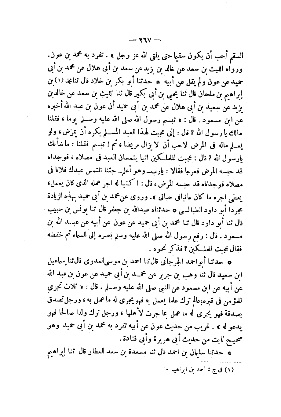 حَدَّثَنَا أَبُو بَكْرِ بْنُ خَلَّادٍ، قَالَ: ثَنَا مُحَمَّدُ بْنُ إِبْرَاهِيمَ بْنِ مِلْحَانَ، قَالَ: ثَنَا يَحْيَى بْنُ أَبِي بُكَيْرٍ، قَالَ: ثَنَا اللَّيْثُ بْنُ سَعْدٍ، عَنْ خَالِدِ بْنِ يَزِيدَ، عَنْ سَعِيدِ بْنِ أَبِي هِلَالٍ، عَنْ مُحَمَّدِ بْنِ أَبِي حُمَيْدٍ، أَنَّ عَوْنَ بْنَ عَبْدِ اللهِ أَخْبَرَهُ، عَنِ ابْنِ مَسْعُودٍ، قَالَ: تَبَسَّمَ رَسُولُ اللهِ صَلَّى اللهُ عَلَيْهِ وَسَلَّمَ يَوْمًا. فَقُلْنَا: مَا لَكَ يَا رَسُولَ اللهِ قَالَ: «إِنِّي §عَجِبْتُ لِهَذَا الْعَبْدِ الْمُسْلِمِ يَكْرَهُ أَنْ يَمْرَضَ، وَلَوْ يَعْلَمُ مَا لَهُ فِي الْمَرَضِ لَأَحَبَّ أَنْ لَا يَزَالَ مَرِيضًا» ثُمَّ تَبَسَّمَ، قُلْنَا: مَا شَأْنُكَ يَا رَسُولَ اللهِ؟ قَالَ: " عَجِبْتُ لِلْمَلَكَيْنِ، أَتَيَا يَلْتَمِسَانِ الْعَبْدَ فِي مُصَلَّاهُ فَوَجَدَاهُ قَدْ حَبَسَهُ الْمَرَضُ، فَعَرَجَا فَقَالَا: يَا رَبِّ، وَهُوَ أَعْلَمُ، جِئْنَا نَلْتَمِسُ عَبْدَكَ فُلَانًا فِي مُصَلَّاهُ فَوَجَدْنَاهُ قَدْ حَبَسَهُ الْمَرَضُ، قَالَ: اكْتُبَا لَهُ أَجْرَ عَمَلِهِ الَّذِي كَانَ يَعْمَلُ، يُعْطَى أَجْرَهُ مَا كَانَ عَانِيًا فِي حِبَالِي ". وَرَوَى عَنْ مُحَمَّدِ بْنِ أَبِي حُمَيْدٍ بِهَذِهِ الزِّيَادَةِ مُجَرَّدًا أَبُو دَاوُدَ الطَّيَالِسِيُّ. حَدَّثَنَاهُ عَبْدُ اللهِ بْنُ جَعْفَرٍ، قَالَ: ثَنَا يُونُسُ بْنُ حَبِيبٍ، قَالَ: ثَنَا أَبُو دَاوُدَ، قَالَ: ثنا مُحَمَّدُ بْنُ أَبِي حُمَيْدٍ، عَنْ عَوْنٍ، عَنْ أَبِيهِ، عَنْ عَبْدِ اللهِ بْنِ مَسْعُودٍ، قَالَ: رَفَعَ رَسُولُ اللهِ صَلَّى اللهُ عَلَيْهِ وَسَلَّمَ بَصَرَهُ إِلَى السَّمَاءِ ثُمَّ خَفَضَهُ فَقَالَ: «عَجِبْتُ لِلْمَلَكَيْنِ»، فَذَكَرَ نَحْوَهُ