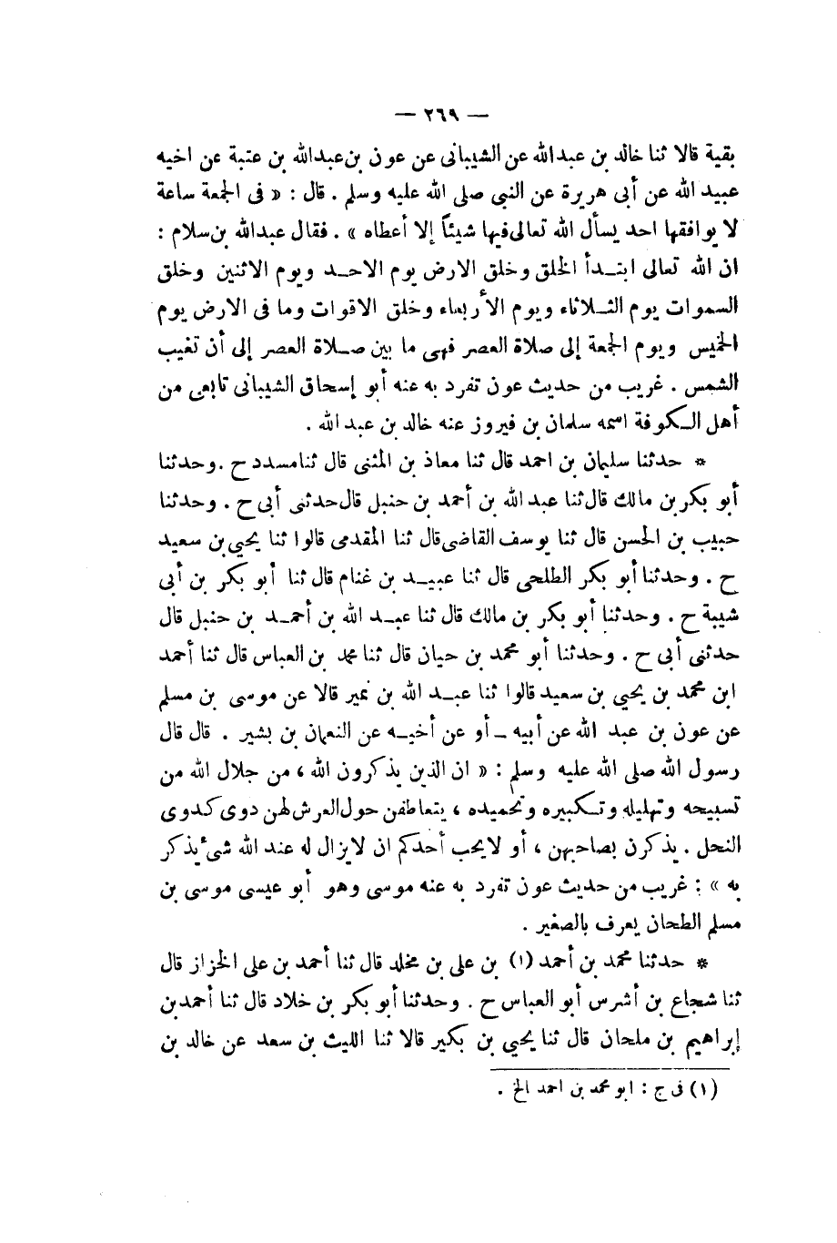 حَدَّثَنَا سُلَيْمَانُ بْنُ أَحْمَدَ، قَالَ: ثَنَا مُعَاذُ بْنُ الْمُثَنَّى، قَالَ: ثَنَا مُسَدَّدٌ، ح. وَحَدَّثَنَا أَبُو بَكْرِ بْنُ مَالِكٍ، قَالَ: ثَنَا عَبْدُ اللهِ بْنُ أَحْمَدَ بْنِ حَنْبَلٍ، قَالَ: حَدَّثَنِي أَبِي ح. وَحَدَّثَنَا حَبِيبُ بْنُ الْحَسَنِ، قَالَ: ثَنَا يُوسُفُ الْقَاضِي، قَالَ: ثَنَا الْمُقَدَّمِيُّ، قَالُوا: ثَنَا يَحْيَى بْنُ سَعِيدٍ، ح. وَحَدَّثَنَا أَبُو بَكْرٍ الطَّلْحِيُّ، قَالَ: ثَنَا عُبَيْدُ بْنُ غَنَّامٍ، قَالَ: ثَنَا أَبُو بَكْرِ بْنُ أَبِي شَيْبَةَ، ح. وَحَدَّثَنَا أَبُو بَكْرِ بْنُ مَالِكٍ، قَالَ: ثَنَا عَبْدُ اللهِ بْنُ أَحْمَدَ بْنِ حَنْبَلٍ، قَالَ: حَدَّثَنِي أَبِي ح. وَحَدَّثَنَا أَبُو مُحَمَّدِ بْنُ حَيَّانَ، قَالَ: ثَنَا مُحَمَّدُ بْنُ الْعَبَّاسِ، قَالَ: ثَنَا أَحْمَدُ بْنُ مُحَمَّدِ بْنِ يَحْيَى بْنِ سَعِيدٍ، قَالُوا: ثَنَا عَبْدُ اللهِ بْنُ نُمَيْرٍ، قَالَا: عَنْ مُوسَى بْنِ مُسْلِمٍ، عَنْ عَوْنِ بْنِ عَبْدِ اللهِ، عَنْ أَبِيهِ، أَوْ عَنْ أَخِيهِ، عَنْ النُّعْمَانِ بْنِ بَشِيرٍ، قَالَ: قَالَ رَسُولُ اللهِ صَلَّى اللهُ عَلَيْهِ وَسَلَّمَ: «إِنَّ §الَّذِينَ يَذْكُرُونَ اللهَ مِنْ جَلَالِ اللهِ مِنْ تَسْبِيحِهِ، وَتَهْلِيلِهِ، وَتَكْبِيرِهِ، وَتَحْمِيدِهِ، يَتَعَاطَفْنَ حَوْلَ الْعَرْشِ لَهُنَّ دَوِيٌّ كَدَوِيِّ النَّحْلِ، يُذَكِّرْنَ بِصَاحِبِهِنَّ، أَوَ لَا يُحِبُّ أَحَدُكُمْ أَنْ لَا يَزَالَ لَهُ عِنْدَ اللهِ شَيْءٌ يُذْكَرُ بِهِ». غَرِيبٌ مِنْ حَدِيثِ عَوْنٍ، تَفَرَّدَ بِهِ عَنْهُ مُوسَى وَهُوَ أَبُو عِيسَى مُوسَى بْنُ مُسْلِمٍ الطَّحَّانُ يُعْرَفُ بِالصَّغِيرِ