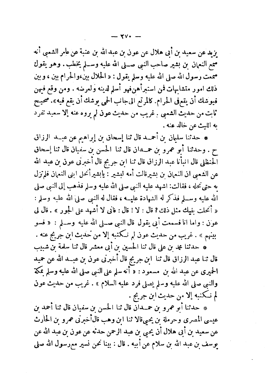 حَدَّثَنَا سُلَيْمَانُ بْنُ أَحْمَدَ، قَالَ: ثَنَا إِسْحَاقُ بْنُ إِبْرَاهِيمَ، عَنْ عَبْدِ الرَّزَّاقِ، ح. وَحَدَّثَنَا أَبُو عَمْرِو بْنُ حَمْدَانَ، قَالَ: ثَنَا الْحَسَنُ بْنُ سُفْيَانَ، قَالَ: ثَنَا إِسْحَاقُ الْحَنْظَلِيُّ، قَالَ: أَنْبَأَنَا عَبْدُ الرَّزَّاقِ، قَالَ: ثَنَا ابْنُ جُرَيْجٍ، قَالَ: أَخْبَرَنِي عَوْنُ بْنُ عَبْدِ اللهِ، عَنِ الشَّعْبِيِّ، أَنَّ النُّعْمَانَ بْنَ بَشِيرٍ، قَالَتْ أُمُّهُ لِبَشِيرٍ: يَا بَشِيرُ، انْحَلِ ابْنِي النُّعْمَانَ، فَلَمْ تَزَلْ بِهِ حَتَّى نَحَلَهُ، فَقَالَتْ: أَشْهِدْ عَلَيْهِ النَّبِيَّ صَلَّى اللهُ عَلَيْهِ وَسَلَّمَ، فَذَهَبَ إِلَى النَّبِيِّ صَلَّى اللهُ عَلَيْهِ وَسَلَّمَ، فَذَكَرَ لَهُ الشَّهَادَةَ عَلَيْهِ، فَقَالَ لَهُ النَّبِيُّ صَلَّى اللهُ عَلَيْهِ وَسَلَّمَ: «أَنَحَلْتَ بَنِيكَ مِثْلَ ذَلِكَ؟». قَالَ: لَا. قَالَ: «فَإِنِّي §لَا أَشْهَدُ عَلَى الْجَوْرِ». قَالَ لِي عَوْنٌ: وَأَمَّا أَنَا فَسَمِعْتُ أَبِي يَقُولُ: قَالَ النَّبِيُّ صَلَّى اللهُ عَلَيْهِ وَسَلَّمَ: «فَسَوِّ بَيْنَهُمْ». غَرِيبٌ مِنْ حَدِيثِ عَوْنٍ لَمْ نَكْتُبْهُ إِلَّا مِنْ حَدِيثِ ابْنِ جُرَيْجٍ عَنْهُ