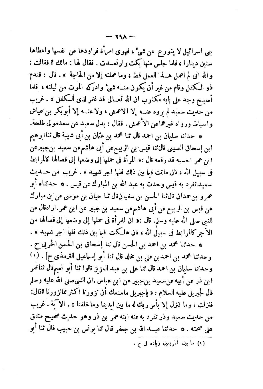 حَدَّثَنَاهُ أَبُو عَمْرِو بْنُ حَمْدَانَ، قَالَ: ثنا الْحَسَنُ بْنُ سُفْيَانَ، قَالَ: ثنا حِبَّانُ بْنُ مُوسَى عَنِ ابْنِ مُبَارَكٍ عَنْ قَيْسِ بْنِ الرَّبِيعِ عَنْ أَبِي هَاشِمٍ عَنْ سَعِيدُ بْنُ جُبَيْرٍ، عَنِ ابْنِ عُمَرَ، أُرَاهُ قَالَ: عَنِ النَّبِيِّ صَلَّى اللهُ عَلَيْهِ وَسَلَّمَ قَالَ: «إِنَّ §لِلْمَرْأَةِ فِي حَمْلِهَا إِلَى وَضْعِهَا إِلَى فِصَالِهَا مِنَ الْأَجْرِ كَالْمُرَابِطِ فِي سَبِيلِ اللهِ، فَإِنْ هَلَكَتْ فِيمَا بَيْنَ ذَلِكَ فَلَهَا أَجْرُ شَهِيدٍ»