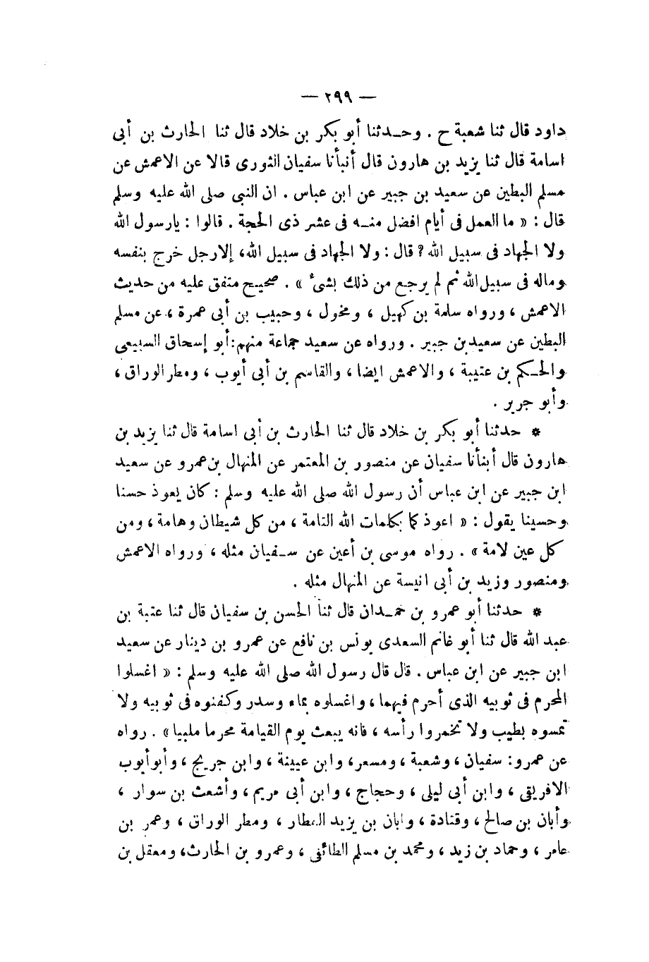 حَدَّثَنَا أَبُو عَمْرِو بْنُ حَمْدَانَ، قَالَ: ثنا الْحَسَنُ بْنُ سُفْيَانَ، قَالَ: ثنا عُتْبَةُ بْنُ عَبْدِ اللهِ، قَالَ: ثنا أَبُو غَانِمٍ السَّعْدِيُّ يُونُسُ بْنُ نَافِعٍ، عَنْ عَمْرِو بْنِ دِينَارٍ، عَنْ سَعِيدِ بْنِ جُبَيْرٍ، عَنِ ابْنِ عَبَّاسٍ، قَالَ: قَالَ رَسُولُ اللهِ صَلَّى اللهُ عَلَيْهِ وَسَلَّمَ: «§اغْسِلُوا الْمُحْرِمَ فِي ثَوْبَيْهِ الَّذِي أَحْرَمَ فِيهِمَا، وَاغْسِلُوهُ بِمَاءٍ وَسِدْرٍ، وَكَفِّنُوهُ فِي ثَوْبَيْهِ، وَلَا تُمِسُّوهُ بِطِيبٍ، وَلَا تُخَمِّرُوا رَأْسَهُ؛ فَإِنَّهُ يُبْعَثُ يَوْمَ الْقِيَامَةِ مُحْرِمًا مُلَبِّيًا». رَوَاهُ عَنْ عَمْرٍو: سُفْيَانُ، وَشُعْبَةُ، وَمِسْعَرٌ، وَابْنُ عُيَيْنَةَ، وَابْنُ جُرَيْجٍ، وَأَبُو أَيُّوبَ الْإِفْرِيقِيُّ، وَابْنُ أَبِي لَيْلَى، وَحَجَّاجٌ، وَابْنُ أَبِي مَرْيَمَ، وَأَشْعَثُ بْنُ سُوَارٍ، وَأَبَانُ بْنُ صَالِحٍ، وَقَتَادَةُ , وَأَبَانُ بْنُ يَزِيدَ الْعَطَّارُ، وَمَطَرٌ الْوَرَّاقُ، وَعُمَرُ بْنُ عَامِرٍ، وَحَمَّادُ بْنُ زَيْدٍ، وَمُحَمَّدُ بْنُ مُسْلِمٍ الطَّائِفِيُّ، وَعَمْرُو بْنُ الْحَارِثِ، وَمَعْقِلُ بْنُ -[300]- عُبَيْدِ اللهِ، وَقَيْسُ بْنُ سَعْدٍ، وَشِبْلُ بْنُ عَبَّادٍ، وَعَبْدُ الْوَهَّابِ بْنُ مُجَاهِدٍ، وَمُقَاتِلُ بْنُ سُلَيْمَانَ. وَرَوَاهُ عَنْ سَعِيدٍ غَيْرُ عَمْرٍو وَابْنِ مُجَاهِدٍ جَمَاعَةٌ مِنْهُمْ: حَبِيبُ بْنُ أَبِي ثَابِتٍ