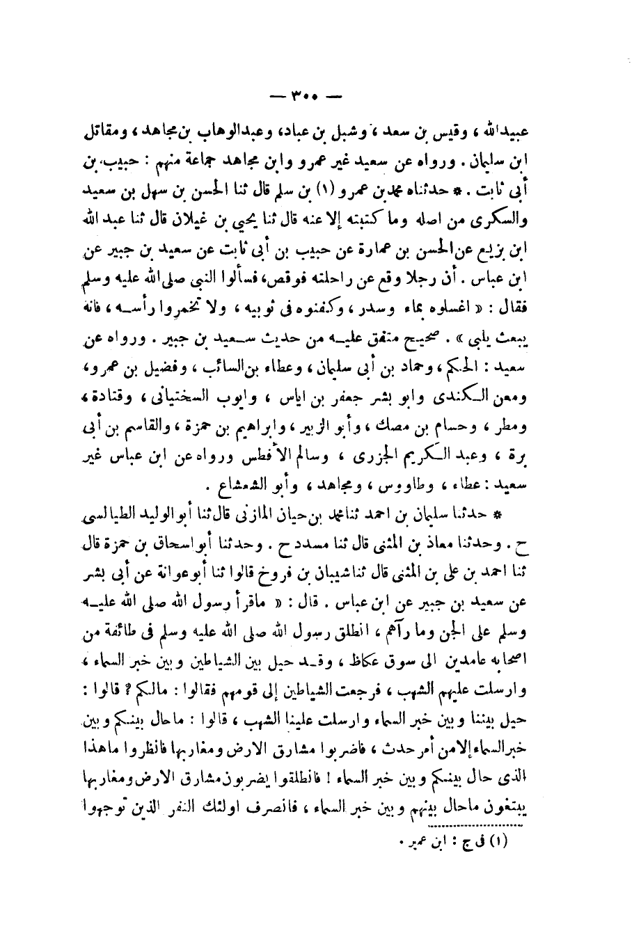 حَدَّثَنَا سُلَيْمَانُ بْنُ أَحْمَدَ، ثنا مُحَمَّدُ بْنُ حَيَّانَ الْمَازِنِيُّ، قَالَ: ثنا أَبُو الْوَلِيدِ الطَّيَالِسِيُّ، ح. وَحَدَّثَنَا مُعَاذُ بْنُ الْمُثَنَّى، قَالَ: ثنا مُسَدَّدٌ، ح. وَحَدَّثَنَا أَبُو إِسْحَاقَ بْنُ حَمْزَةَ، قَالَ: ثنا أَحْمَدُ بْنُ عَلِيِّ بْنِ الْمُثَنَّى، قَالَ: ثنا شَيْبَانُ بْنُ فَرُّوخٍ، قَالُوا: ثنا أَبُو عَوَانَةَ، عَنْ أَبِي بِشْرٍ، عَنْ سَعِيدِ بْنِ جُبَيْرٍ، عَنِ ابْنِ عَبَّاسٍ، قَالَ: مَا قَرَأَ رَسُولُ اللهِ صَلَّى اللهُ عَلَيْهِ وَسَلَّمَ عَلَى الْجِنِّ وَمَا رَآهُمُ، انْطَلَقَ رَسُولُ اللهِ صَلَّى اللهُ عَلَيْهِ وَسَلَّمَ فِي طَائِفَةٍ مِنْ أَصْحَابِهِ عَامِدِينَ إِلَى سُوقِ عُكَاظٍ وَقَدْ حِيلَ بَيْنَ الشَّيَاطِينِ وَبَيْنَ خَبَرِ السَّمَاءِ وَأُرْسِلَتْ عَلَيْهِمُ الشُّهُبُ، فَرَجَعَتِ الشَّيَاطِينُ إِلَى قَوْمِهِمْ، فَقَالُوا: مَالَكُمْ؟ قَالُوا: حِيلَ بَيْنَنَا وَبَيْنَ خَبَرِ السَّمَاءِ، وَأُرْسِلَتْ عَلَيْنَا الشُّهُبُ، قَالُوا: §مَا حَالَ بَيْنَكُمْ وَبَيْنَ خَبَرِ السَّمَاءِ إِلَّا مَنْ أَمْرٍ حَدَثَ، فَاضْرِبُوا مَشَارِقَ الْأَرْضِ وَمَغَارِبَهَا فَانْظُرُوا مَا هَذَا الَّذِي حَالَ بَيْنَكُمْ وَبَيْنَ خَبَرِ السَّمَاءِ. فَانْطَلَقُوا يَضْرِبُونَ مَشَارِقَ الْأَرْضِ وَمَغَارِبَهَا يَبْتَغُونَ مَا حَالَ بَيْنَهُمْ وَبَيْنَ خَبَرِ السَّمَاءِ، فَانْصَرَفَ أُولَئِكَ النَّفْرُ الَّذِينَ تَوَجَّهُوا -[301]- نَحْوَ تِهَامَةَ إِلَى رَسُولِ اللهِ صَلَّى اللهُ عَلَيْهِ وَسَلَّمَ وَهُوَ وَأَصْحَابُهُ بِنَخْلَةَ عَامِدِينَ إِلَى سُوقِ عُكَاظٍ وَهُوَ يُصَلِّي بِأَصْحَابِهِ صَلَاةَ الْفَجْرِ، فَلَمَّا سَمِعُوا الْقُرْآنَ اسْتَمَعُوا، قَالُوا: هَذَا وَاللهِ الَّذِي حَالَ بَيْنَكُمْ وَبَيْنَ خَبَرِ السَّمَاءِ، فَهُنَالِكَ حِينَ رَجَعُوا إِلَى قَوْمِهِمْ، {فَقَالُوا: إِنَّا سَمِعْنَا قُرْآنًا عَجَبًا يَهْدِي إِلَى الرُّشْدِ فَآمَنَّا بِهِ وَلَنْ نُشْرِكَ بِرَبِّنَا أَحَدًا} [الجن: 2]، فَأَنْزَلَ اللهُ عَزَّ وَجَلَّ عَلَى نَبِيِّهِ صَلَّى اللهُ عَلَيْهِ وَسَلَّمَ قُلْ أُوحِيَ إِلَيَّ أَنَّهُ اسْتَمَعَ نَفَرٌ مِنَ الْجِنِّ وَإِنَّمَا أَوْحَى إِلَيْهِ قَوْلَ الْجِنِّ. صَحِيحٌ مُتَّفَقٌ عَلَيْهِ. أَخْرَجَهُ الْبُخَارِيُّ عَنْ مُسَدَّدٍ، عَنْ أَبِي عَوَانَةَ