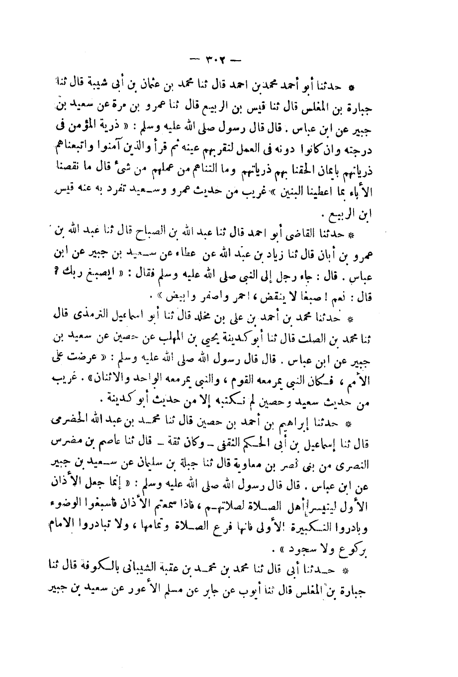حَدَّثَنَا مُحَمَّدُ بْنُ أَحْمَدَ بْنِ عَلِيِّ بْنِ مَخْلَدٍ، قَالَ: ثنا أَبُو إِسْمَاعِيلَ التِّرْمِذِيُّ، قَالَ: ثنا مُحَمَّدُ بْنُ الصَّلْتِ، قَالَ: ثنا أَبُو كُدَيْنَةَ يَحْيَى بْنُ الْمُهَلَّبِ، عَنْ حُصَيْنٍ، عَنْ سَعِيدِ بْنِ جُبَيْرٍ، عَنِ ابْنِ عَبَّاسٍ، قَالَ: قَالَ رَسُولُ اللهِ صَلَّى اللهُ عَلَيْهِ وَسَلَّمَ: «§عُرِضَتْ عَلَيَّ الْأُمَمُ، فَكَانَ النَّبِيُّ يَمُرُّ مَعَهُ الْقَوْمُ، وَالنَّبِيُّ يَمُرُّ مَعَهُ الْوَاحِدُ وَالِاثْنَانِ». غَرِيبٌ مِنْ حَدِيثِ سَعِيدٍ وَحُصَيْنٍ، لَمْ نَكْتُبْهُ إِلَّا مِنْ حَدِيثِ أَبُو كُدَيْنَةَ