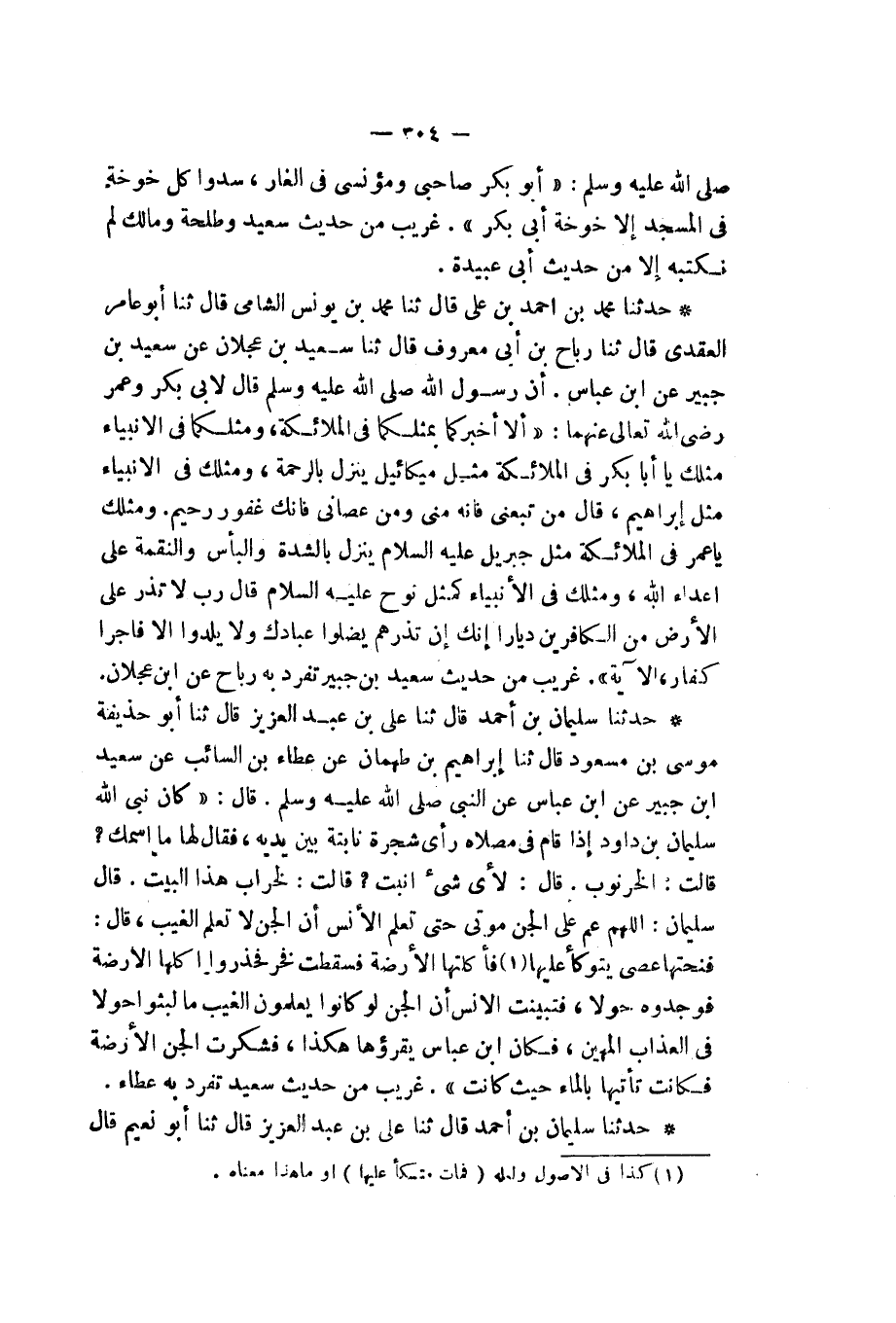 حَدَّثَنَا سُلَيْمَانُ بْنُ أَحْمَدَ، قَالَ: ثنا عَلِيُّ بْنُ عَبْدِ الْعَزِيزِ، قَالَ: ثنا أَبُو حُذَيْفَةَ مُوسَى بْنُ مَسْعُودٍ قَالَ: ثنا إِبْرَاهِيمُ بْنُ طَهْمَانَ، عَنْ عَطَاءِ بْنِ السَّائِبِ، عَنْ سَعِيدِ بْنِ جُبَيْرٍ، عَنِ ابْنِ عَبَّاسٍ، عَنِ النَّبِيِّ صَلَّى اللهُ عَلَيْهِ وَسَلَّمَ قَالَ: " كَانَ نَبِيُّ اللهِ سُلَيْمَانُ بْنُ دَاوُدَ إِذَا قَامَ فِي مُصَلَّاهُ §رَأَى شَجَرَةً نَابِتَةً بَيْنَ يَدَيْهِ فَقَالَ لَهَا: مَا اسْمُكِ؟ قَالَتْ: الْخَرْنُوبُ. قَالَ: لِأَيِّ شَيْءٍ أَنْبُتُ؟ قَالَتْ: لِخَرَابِ هَذَا الْبَيْتِ. قَالَ سُلَيْمَانُ: اللهُمَّ عَمِّ عَلَى الْجِنِّ مَوْتِي حَتَّى تَعْلَمَ الْإِنْسُ أَنَّ الْجِنَّ لَا تَعْلَمُ الْغَيْبَ، قَالَ: فَنَحَتَهَا عَصًى يَتَوَكَّأُ عَلَيْهَا، فَأَكَلَتْهَا الْأَرَضَةُ فَسَقَطَتْ، فَخَرَّ، فَحَذَّرُوا أَكْلَهَا الْأَرَضَةَ فَوَجَدُوهُ حَوْلًا، فَتَبَيَّنَتِ الْإِنْسُ أَنَّ الْجِنَّ لَوْ كَانُوا يَعْلَمُونَ الْغَيْبَ مَا لَبِثُوا حَوْلًا فِي الْعَذَابِ الْمُهِينِ «. فَكَانَ ابْنُ عَبَّاسٍ يَقْرَؤُهَا هَكَذَا، فَشَكَرَتِ الْجِنُّ الْأَرَضَةَ فَكَانَتْ تَأْتِيهَا بِالْمَاءِ حَيْثُ كَانَتْ». غَرِيبٌ مِنْ حَدِيثِ سَعِيدٍ تَفَرَّدَ بِهِ عَطَاءٌ