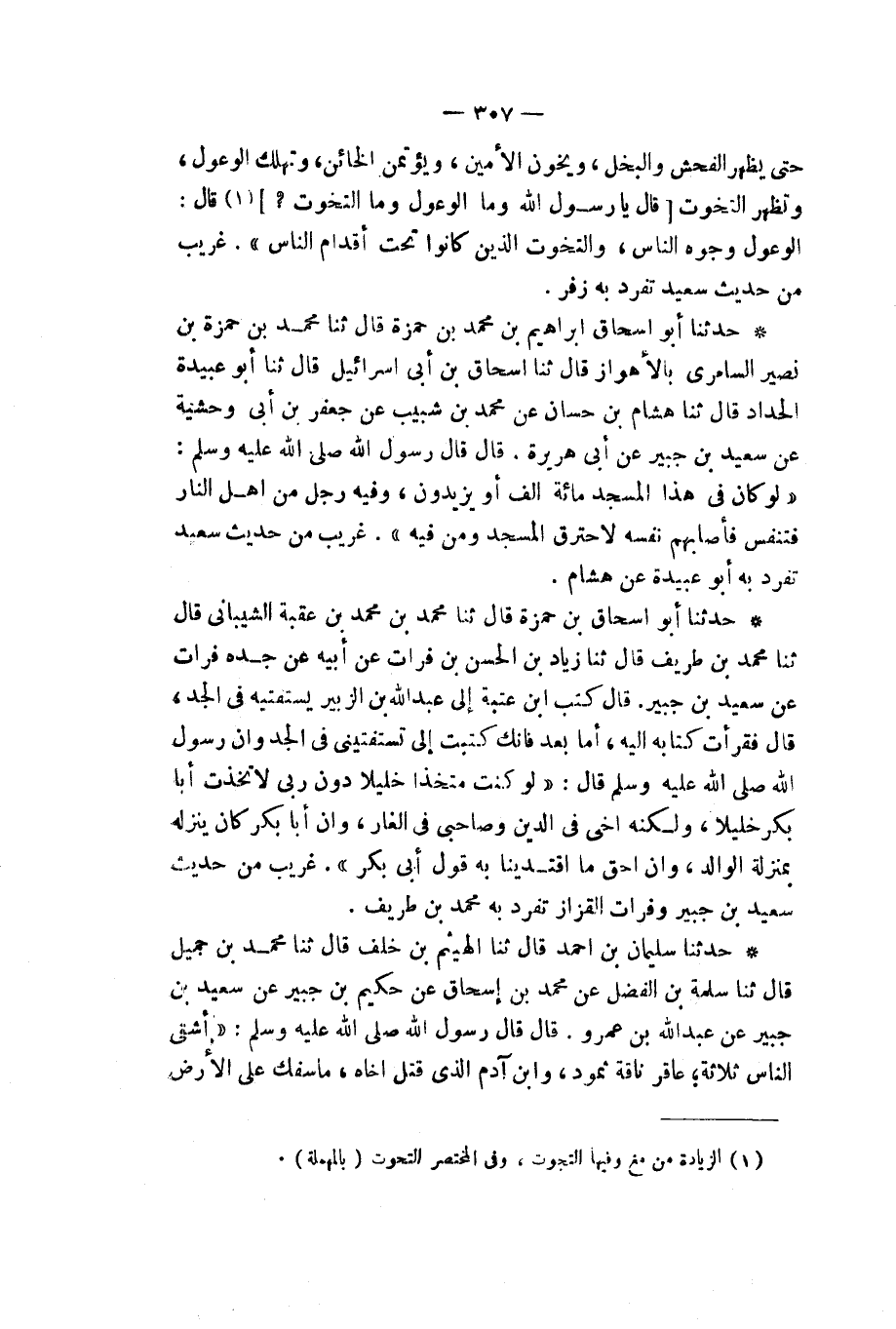 حَدَّثَنَا أَبُو إِسْحَاقَ إِبْرَاهِيمُ بْنُ مُحَمَّدِ بْنِ حَمْزَةَ قَالَ: ثنا مُحَمَّدُ بْنُ حَمْزَةَ بْنِ نُصَيْرٍ السَّامِرِيُّ، بِالْأَهْوَازِ قَالَ: ثنا إِسْحَاقُ بْنُ أَبِي إِسْرَائِيلَ، قَالَ: ثنا أَبُو عُبَيْدَةَ الْحَدَّادُ، قَالَ: ثنا هِشَامُ بْنُ حَسَّانَ، عَنْ مُحَمَّدِ بْنِ شَبِيبٍ، عَنْ جَعْفَرِ بْنِ أَبِي وَحْشِيَّةَ، عَنْ سَعِيدِ بْنِ جُبَيْرٍ، عَنْ أَبِي هُرَيْرَةَ، قَالَ: قَالَ رَسُولُ اللهِ صَلَّى اللهُ عَلَيْهِ وَسَلَّمَ: «§لَوْ كَانَ فِي هَذَا الْمَسْجِدِ مِائَةُ أَلْفٍ أَوْ يَزِيدُونَ وَفِيهِ رَجُلٌ مِنْ أَهْلِ النَّارِ فَتَنَفَّسَ فَأَصَابَهُمْ نَفَسُهُ لَاحْتَرَقَ الْمَسْجِدُ وَمَنْ فِيهِ». غَرِيبٌ مِنْ حَدِيثِ سَعِيدٍ، تَفَرَّدَ بِهِ أَبُو عُبَيْدَةَ عَنْ هِشَامٍ
