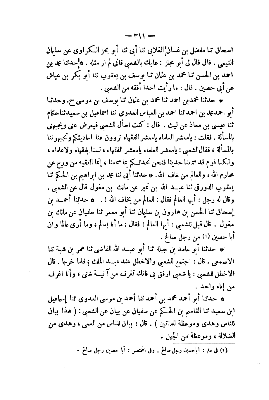حَدَّثَنَا أَحْمَدُ بْنُ إِسْحَاقَ، ثنا الْحَسَنُ بْنُ هَارُونَ بْنِ سُلَيْمَانَ، ثنا أَبُو مَعْمَرٍ، ثنا سُفْيَانُ، عَنْ مَالِكِ بْنِ مِغْوَلٍ، قَالَ: قِيلَ لِلشَّعْبِيِّ: أَيُّهَا الْعَالِمُ، فَقَالَ: «§مَا أَنَا بِعَالِمٍ، وَمَا أَرَى عَالِمًا، وَإِنَّ أَبَا حُصَيْنٍ مِنْ رَجُلٍ صَالِحٍ»