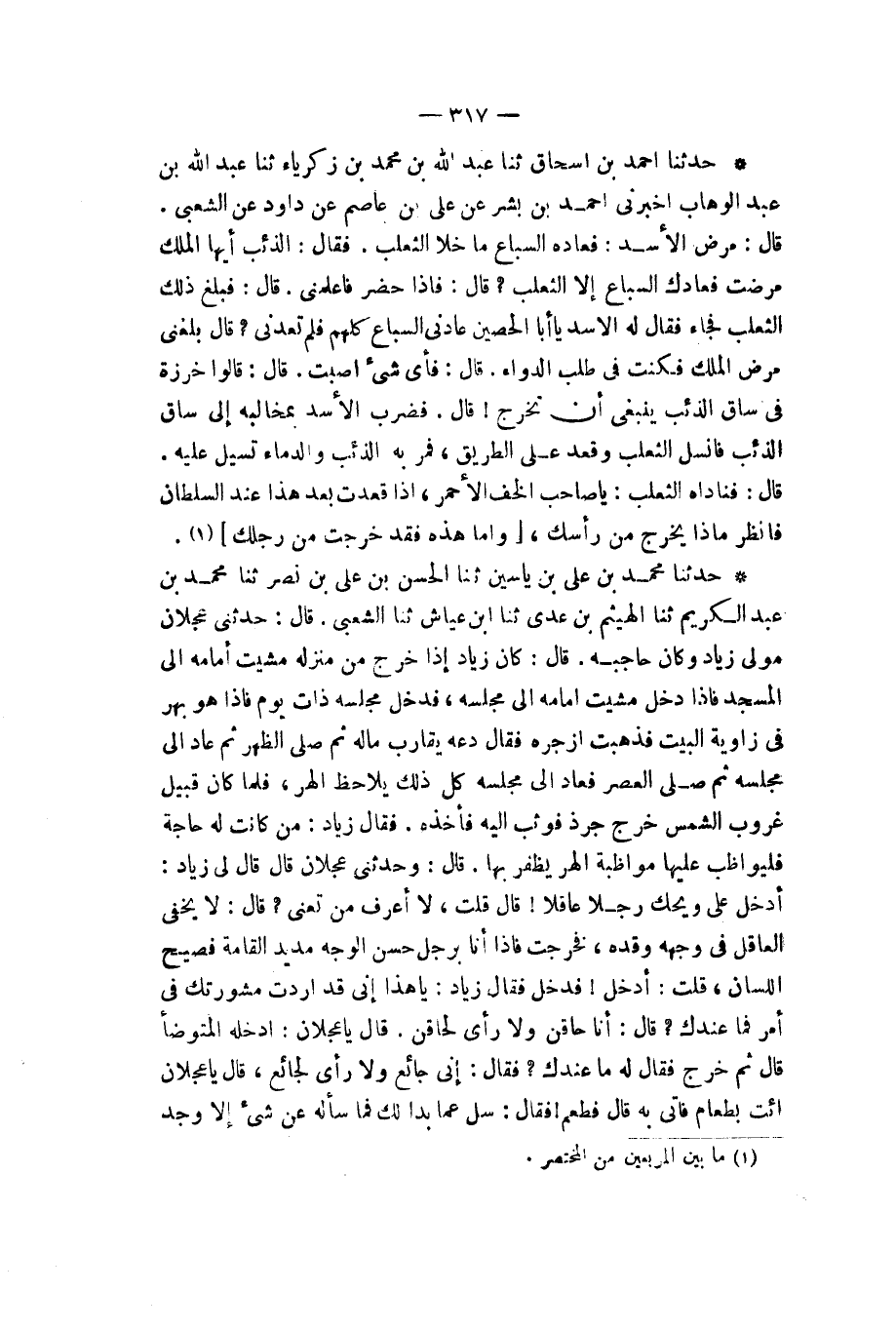 حَدَّثَنَا أَحْمَدُ بْنُ إِسْحَاقَ، ثنا عَبْدُ اللهِ بْنُ مُحَمَّدِ بْنِ زَكَرِيَّاءَ، ثنا عَبْدُ اللهِ بْنُ عَبْدِ الْوَهَّابِ، أَخْبَرَنِي أَحْمَدُ بْنُ بِشْرٍ، عَنْ عَلِيِّ بْنِ عَاصِمٍ، عَنْ دَاوُدَ، عَنِ الشَّعْبِيِّ، قَالَ: " مَرِضَ الْأَسَدُ فَعَادَهُ السِّبَاعُ مَا خَلَا الثَّعْلَبُ، فَقَالَ الذِّئْبُ: أَيُّهَا الْمَلِكُ، مَرِضْتَ فَعَادَكَ السِّبَاعُ إِلَّا الثَّعْلَبُ. قَالَ: فَإِذَا حَضَرَ فَأَعْلِمْنِي. قَالَ: فَبَلَغَ ذَلِكَ الثَّعْلَبَ فَجَاءَ، فَقَالَ لَهُ الْأَسَدُ: يَا أَبَا الْحُصَيْنِ، عَادَنِي السِّبَاعُ كُلُّهُمْ، فَلَمْ تَعُدْنِي. قَالَ: بَلَغَنِي مَرَضُ الْمَلِكِ فَكُنْتُ فِي طَلَبِ الدَّوَاءِ. قَالَ: فَأَيَّ شَيْءٍ أَصَبْتَ؟ قَالَ: قَالُوا: خَرَزَةٌ فِي سَاقِ الذِّئْبِ يَنْبَغِي أَنْ تُخْرَجَ. قَالَ: فَضَرَبَ الْأَسَدُ بِمَخَالِبِهِ إِلَى سَاقِ الذِّئْبِ، فَانْسَلَّ الثَّعْلَبُ وَقَعَدَ عَلَى الطَّرِيقِ، فَمَرَّ بِهِ الذِّئْبُ وَالدِّمَاءُ تَسِيلُ عَلَيْهِ، قَالَ: فَنَادَاهُ الثَّعْلَبُ: يَا صَاحِبِ الْخُفِّ الْأَحْمَرِ، §إِذَا قَعَدْتَ بَعْدَ هَذَا عِنْدَ السُّلْطَانِ فَانْظُرْ مَاذَا يَخْرُجُ مِنْ رَأْسِكَ، وَأَمَّا هَذِهِ فَقَدْ خَرَجَتْ مِنْ رِجْلِكَ "