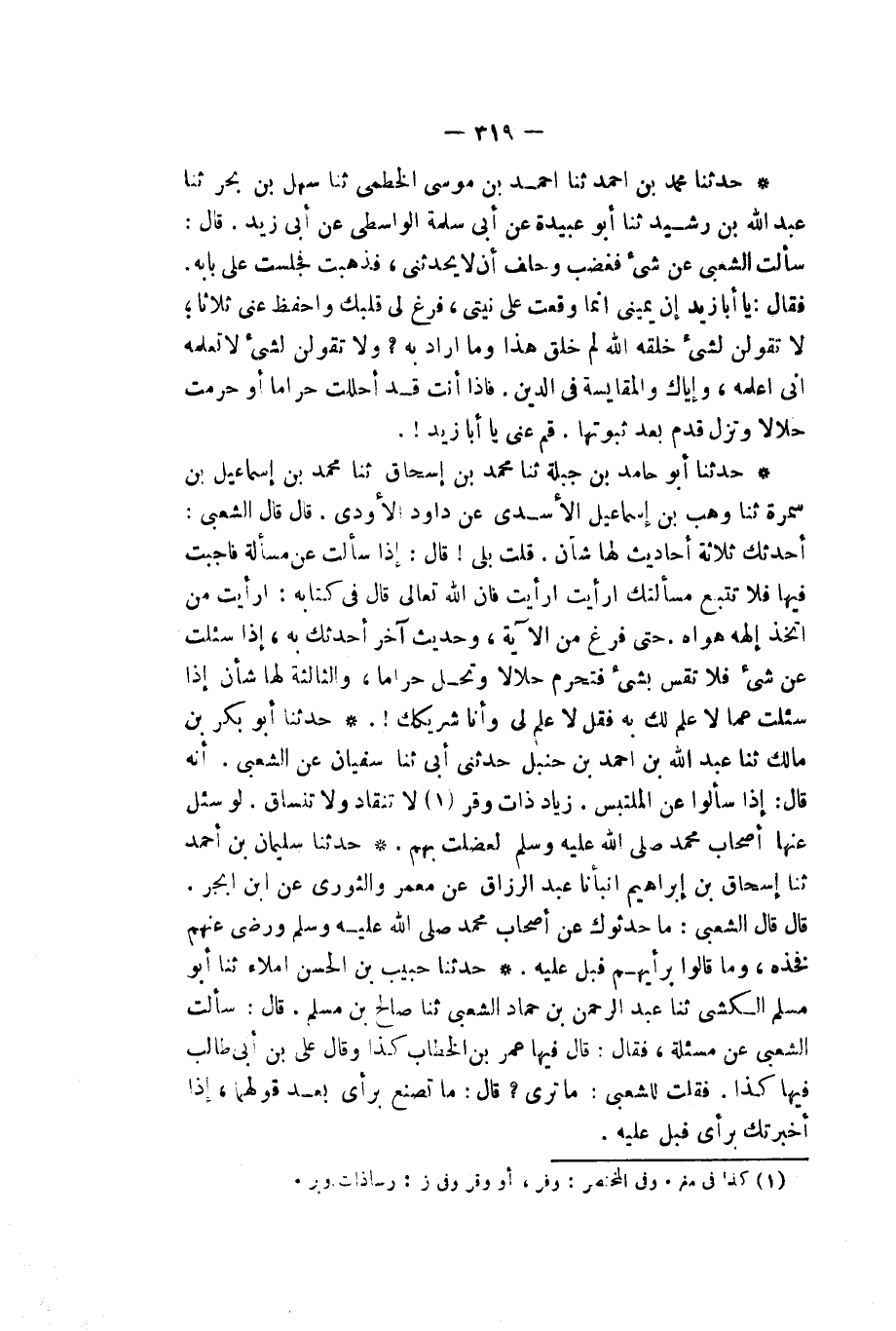 حَدَّثَنَا مُحَمَّدُ بْنُ أَحْمَدَ، ثنا أَحْمَدُ بْنُ مُوسَى الْخَطْمِيُّ، ثنا سَهْلُ بْنُ بَحْرٍ، ثنا عَبْدُ اللهِ بْنُ رُشَيْدٍ، ثنا أَبُو عُبَيْدَةَ، عَنْ أَبِي سَلَمَةَ الْوَاسِطِيِّ، عَنْ أَبِي زَيْدٍ، قَالَ: سَأَلْتُ الشَّعْبِيَّ عَنْ شَيْءٍ، فَغَضِبَ وَحَلَفَ أَنْ لَا يُحَدِّثَنِي، فَذَهَبْتُ فَجَلَسْتُ عَلَى بَابِهِ، فَقَالَ: " يَا أَبَا زَيْدٍ، إِنَّ يَمِينِي إِنَّمَا وَقَعَتْ عَلَى نِيَّتِي، فَرِّغْ لِي قَلْبَكَ، وَاحْفَظْ عَنِّي ثَلَاثًا: §لَا تَقُولَنَّ لِشَيْءٍ خَلَقَهُ اللهُ لِمَ خَلَقْ هَذَا، وَمَا أَرَادَ بِهِ، وَلَا تَقُولَنَّ لِشَيْءٍ لَا تَعْلَمُهُ إِنِّي أَعْلَمُهُ، وَإِيَّاكَ وَالْمُقَايَسَةَ فِي الدِّينِ، فَإِذَا أَنْتَ قَدْ أَحْلَلْتَ حَرَامًا، أَوْ حَرَّمْتَ حَلَالًا، وَتَزِلُّ قَدَمٌ بَعْدَ ثُبُوتِهَا؛ قُمْ عَنِّي يَا أَبَا زَيْدٍ "