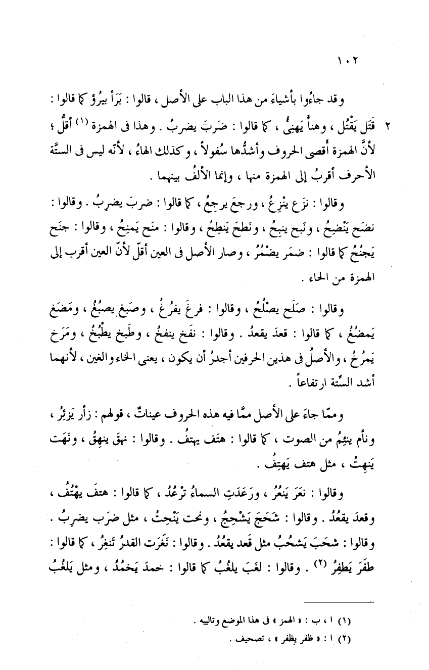 وقد جاءوا بأشياء من هذا الباب على الأصل، قالوا: برأ يبرؤ كما قالوا: قتل يقتل، وهنأ يهنىء، كما قالوا: ضرب يضرب. وهذا في الهمزة أقل؛ لأن الهمزة أقصى الحروف وأشدها سفولاً، وكذلك الهاء، لأنه ليس في الستة الأحرف أقرب إلى الهمزة منها، وإنما الألف بينهما.