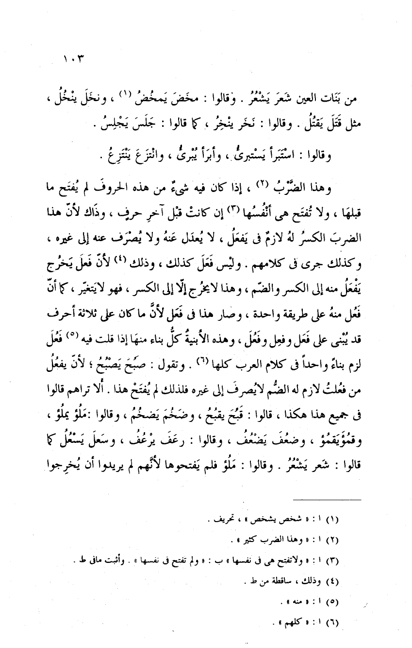 وهذا الضرب، إذا كان فيه شيءٌ من هذه الحروف لم يفتح ما قبلها، ولا تفتح هي أنفسها إن كانت قبل آخر حرفٍ، وذاك لأن هذا الضرب الكسر له لازمٌ في يفعل، لا يعدل عنه ولا يصرف عنه إلى غيره، وكذلك جرى في كلامهم. وليس فعل كذلك، وذلك لأن فعل يخرج يفعل منه إلى الكسر والضم، وهذا لا يخرج إلا إلى الكسر، فهو لا يتغير، كما أن فعل منه على طريقة واحدة، وصار هذا في فعل لأن ما كان على ثلاثة أحرف قد يبنى على فعل وفعل وفعل، وهذه الأبنية كل بناء منها إذا قلت فيه فعل لزم بناءً واحداً في كلام العرب كلها. وتقلو: صبح يصبح؛ لأن يفعل من فعلت لازمٌ له الضم لا يصرف إلى غيره فلذلك لم يفتح هذا. ألا تراهم قالوا في جميع هذا هكذا، قالوا: قبح يقبح، وضخم يضخم، وقالوا: ملؤ يملؤ، وقمؤ يقمؤ، وضعف يضعف، وقالوا: رعف يرعف، وسعل يسعل كما قالوا: شعر يشعر. وقالوا: ملؤ فلم يفتحوها لأنهم لم يريدوا أن يخرجوا