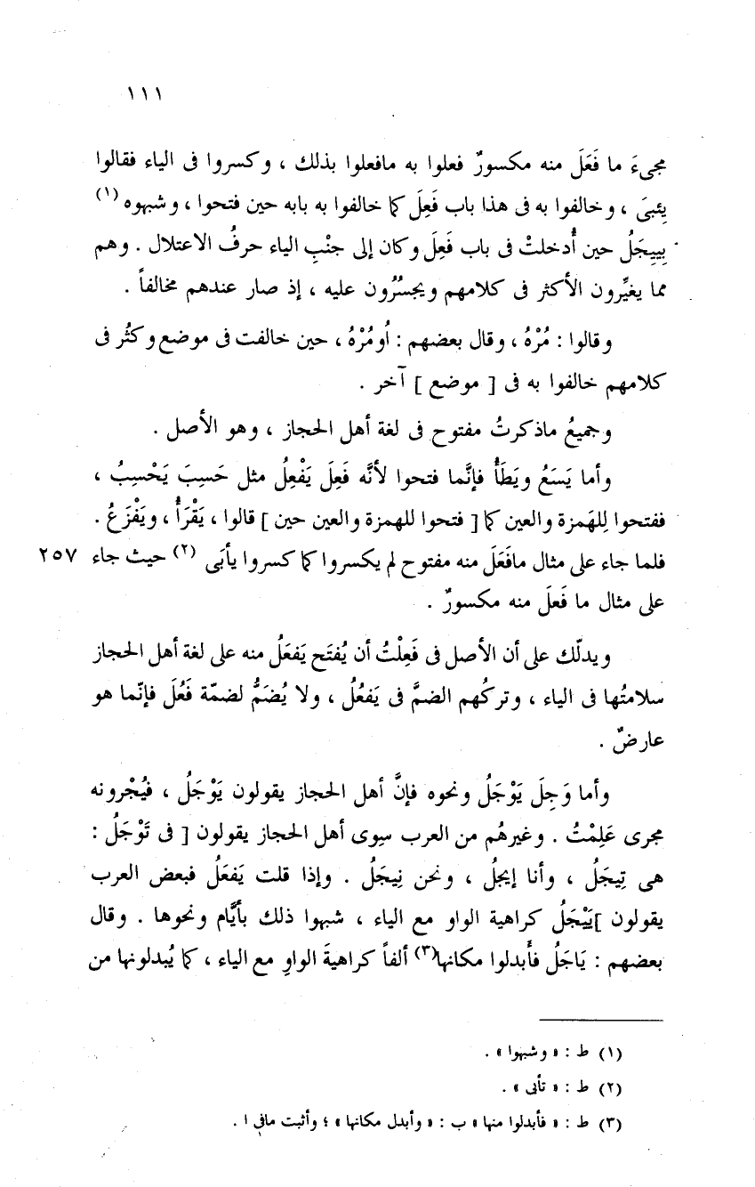 وأما وجل يوجل ونحوه فإن أهل الحجاز يقولون يوجل، فيجرونه مجرى علمت. وغيرهم من العرب سوى أهل الحجاز يقولون في توجل: هي تيجل، وأنا إيجل، ونحن نيجل. وإذا قلت يفعل فبعض العرب يقولون ييجل كراهية الواو مع الياء، شبهوا ذلك بأيام ونحوها. وقال بعضهم: ياجل فأبدلوا مكانها ألفاً كراهية الواو مع الياء، كما يبدلوننها من