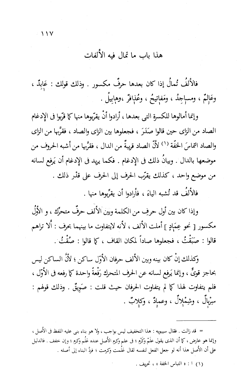 فالألف تمال إذا كان بعدها حرفٌ مكسور. وذلك قولك: عابدٌ، وعالمٌن ومساجد، ومفاتيح، وعذافرٌ، وهابيل.