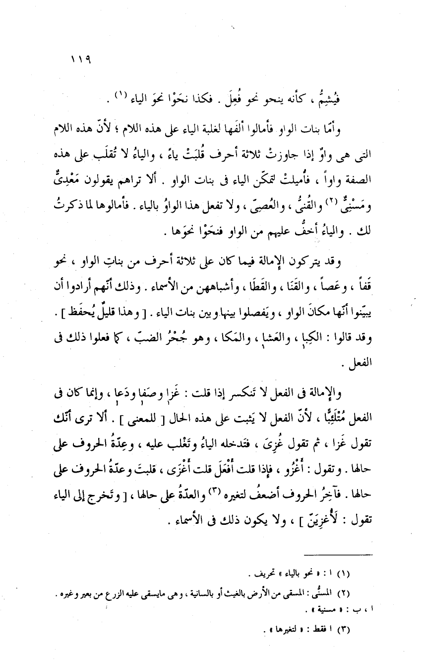 وقد يتركون الإمالة فيما كان على ثلاثة أحرف من بنات الواو، نحو قفاً، وعصاً، والقنا، والقطا، وأشباههن من الأسماء. وذلك أنهم أرادوا أن يبينوا أنها مكان الواو، ويفصلوا بينها وبين بنات الياء. وهذا قليلٌ يحفظ. وقد قالوا: الكبا، والعشا، والمكا، وهو جحر الضب، كما فعلوا ذلك في الفعل.