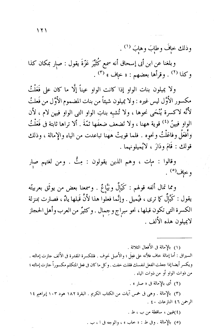 ولا يميلون بنات الواو إذا كانت الواو عيناً إلا ما كان على فعلت مكسور الأول ليس غيره: ولا يميلون شيئاً من بنات المضموم الأول من فعلت لأنه لا كسرة ينحى نحوها، ولا تشبه بنات الواو التي الواو فيهن لام، لأن الواو فيهن قوية ههنا، ولا تضعف ضعفها ثمة. ألا تراها ثابتة في فعلت وأفعل وفاعلت ونحوه. فلما قويت ههنا تباعدت من الياء والإمالة، وذلك قولك: قام ودار، لا يميلونهما.