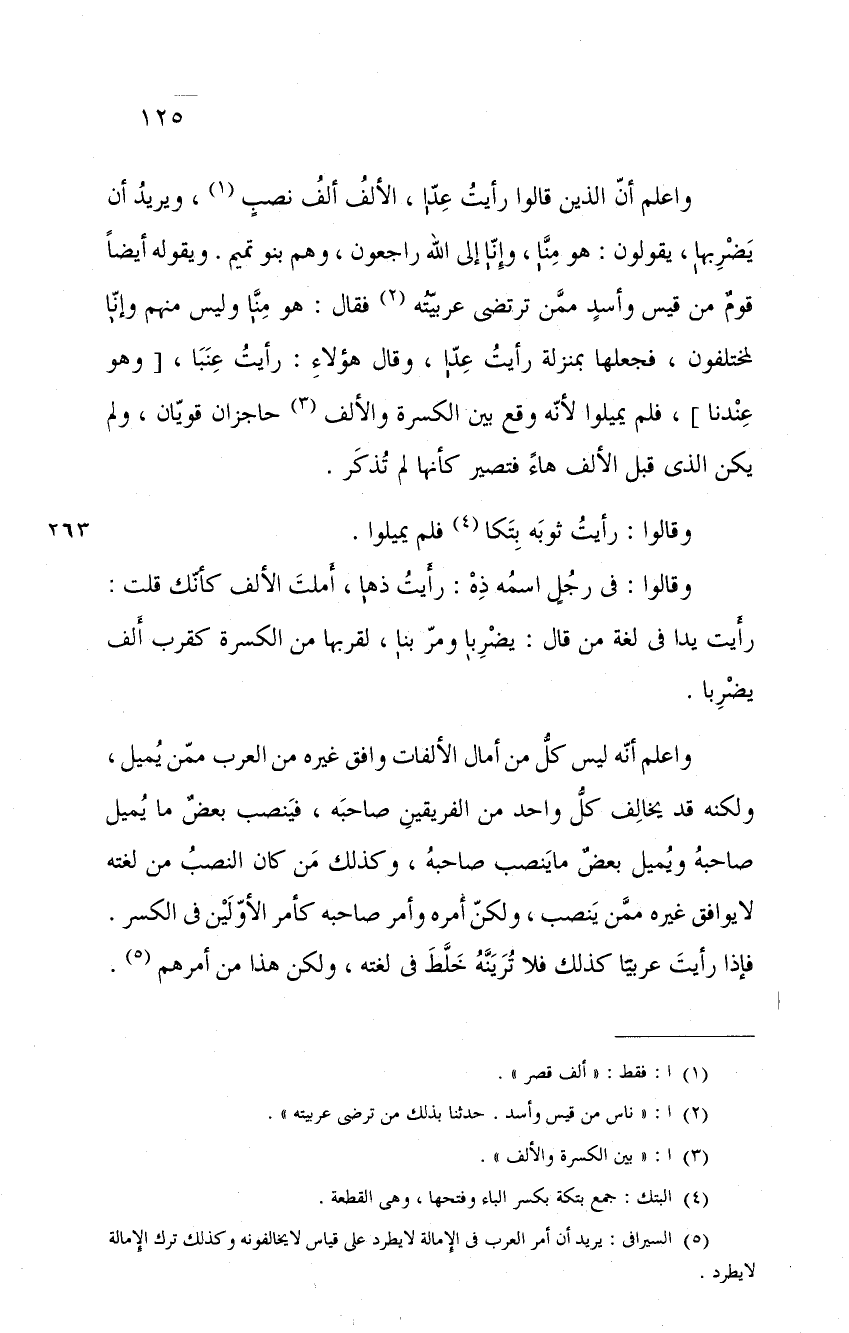 واعلم أنه ليس كل من أمال الألفات وافق غيره من العرب ممن يميل، ولكنه قد يخالف كل واحد من الفريقين صاحبه، فينصب بعضٌ ما يميل صاحبه ويميل بعضٌ ما ينصب صاحبه، وكذلك من كان النصب من لغته لا يوافق غيره ممن ينصب، ولكن أمره وأمر صاحبه كأمر الأولين في الكسر. فإذا رأيت عربيا كذلك فلا ترينه خلط في لغته، ولكن هذا من أمرهم.