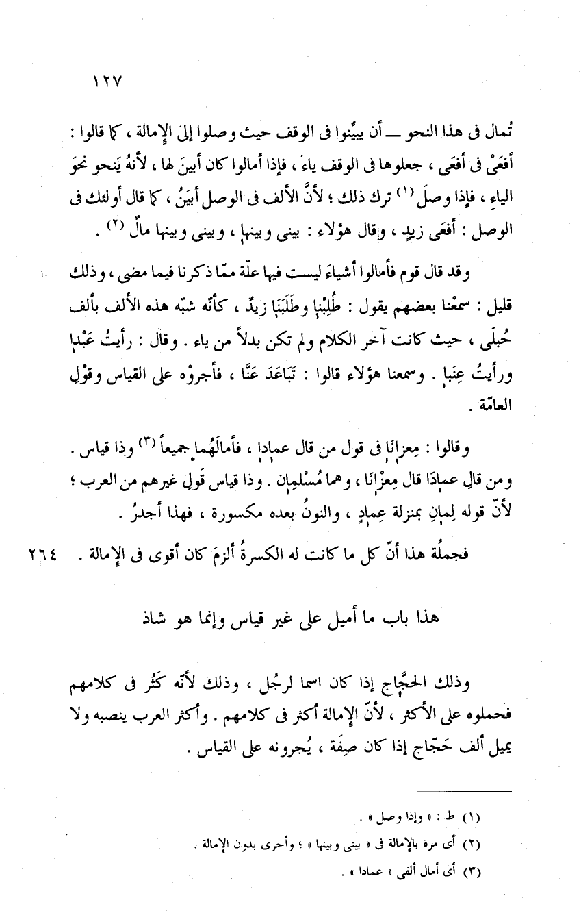 وإنما هو شاذ وذلك الحجاج إذا كان اسما لرجل، وذلك لأنته كثر في كلامهم فحملوه على الأكثر، لأن الإمالة أكثر في كلامهم. وأكثر العرب ينصبه ولا يميل ألف حجاج إذا كان صفة، يجرونه على القياس.