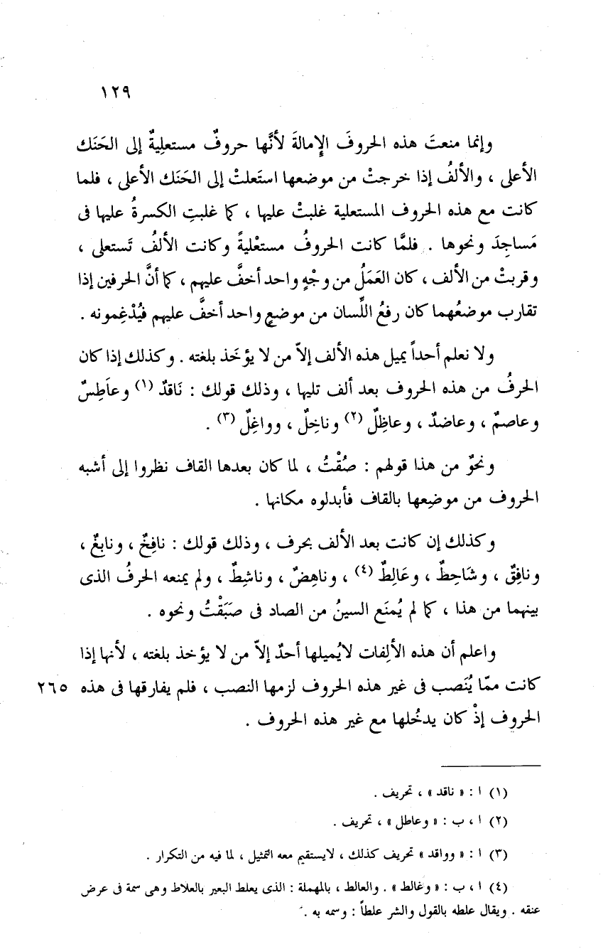 ولا نعلم أحداً يميل هذه الألف إلا من لا يؤخذ بلغته. وكذلك إذا كان الحرف من هذه الحروف بعد ألف تليها، وذلك قولك: ناقدٌ وعاطسٌ وعاصمٌ، وعاضدٌن وعاظلٌ وناخلٌ، وواغلٌ.