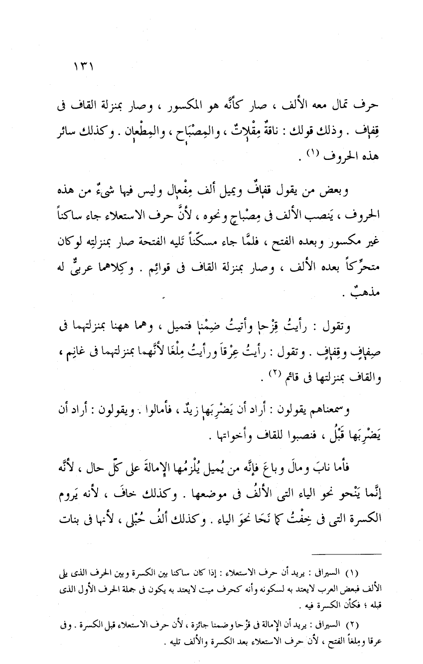 وبعض من يقول قفافٌ ويميل ألف مفعالٍ وليس فيها أشيءٌ من هذه الحروف، ينصب الألف في مصباحٍ ونحوه، لأن حرف الاستعلاء جاء ساكناً غير مكسور وبعده الفتح، فلما جاء مسكناً تليه الفتحة صار بمنزلته لو كان متحركاً بعده الألف، وصار بمنزلة القاف في قوائم. وكلاهما عربيٌّ له مذهبٌ.