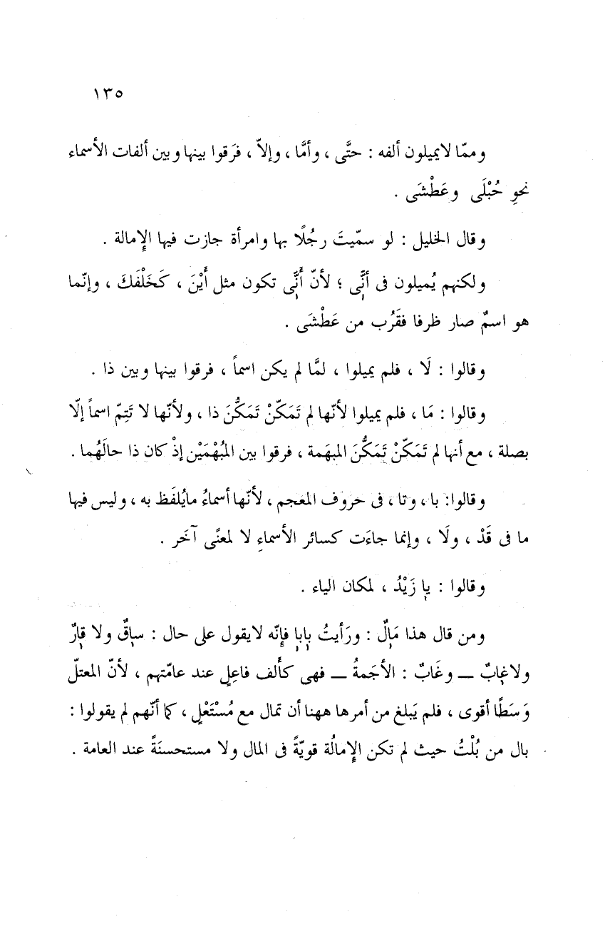 ومما لا يميلون ألفه: حتى وأما، وإلا، فرقوا بينها وبين ألفات الأسماء نحو حبلى وعطشى.