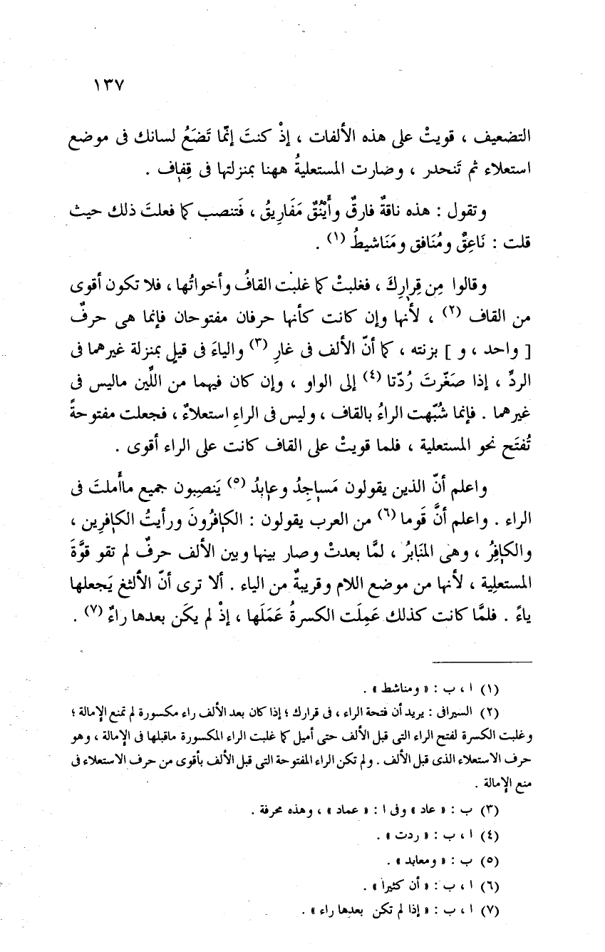 واعلم أن قوماً من العرب يقولون: الكافرون ورأيت الكافرين، والكافر، وهي المنابر، لما بعدت وصار بينها وبين الألف حرفٌ لم تقو قوة المستعلية، لأنها من موضع اللام وقريبةٌ من الياء. ألا ترى أن الألثغ يجعلها ياءً. فما كانت كذلك عملت الكسرة عملها إذ لم يكن بعدها راءٌ.