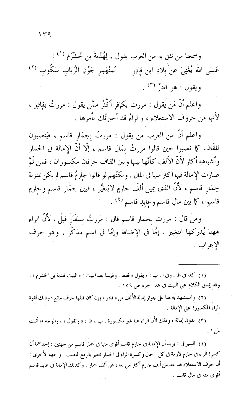 واعلم أن من العرب من يقول: مررت بحمار قاسم، فينصبون للقاف كما نصبوا حين قالوا مررت بمال قاسم، إلا أن الإمالة في الحمار وأشباهه أكثر، لأن الألف كأنها بينها وبين القاف حرفان مكسوران، فمن ثم صارت الإمالة فيها أكثر منها في المال. ولكنهم لو قالوا جارم قاسم لم يكن بمنزلة حمار قاسم، لأن الذي يميل ألف جارمٍ لا يتغير، فبين حمار قاسم وجارم قاسمٍ. كما بين مال قاسم وعابد قاسم.
