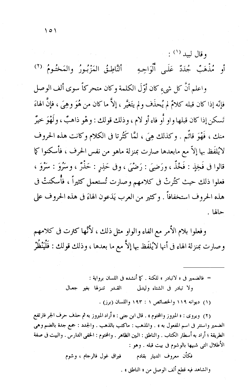 واعلم أن كل شيءٍ كان أول الكلمة وكان متحركاً سوى ألف الوصل فإنه إذا كان قبله كلامٌ لم يحذف ولم يتغير، إلا ما كان من هو وهي، فإن الهاء تسكن إذا كان قبلها واو أو فاء أو لام، وذلك قولك: وهو ذاهبٌ، ولهو خيرٌ منك، فهو قائمٌ. وكذلك هي، لما كثرتا في الكلام وكانت هذه الحروف لا يلفظ بها إلا مع ما بعدها صارت بمنزلة ما هو من نفس الحرف، فأسكنوا كما قالوا في فخذٍ: فخذٌ، ورضي: رضى، وفي حذر: حذرٌ، وسرو: سرو، فعلوا ذلك حيث كثرت في كلامهم وصارت تستعمل كثيراً، فأسكنت في هذه الحروف استخفافاً. وكثير من العرب يدعون الهاء في هذه الحروف على حالها.