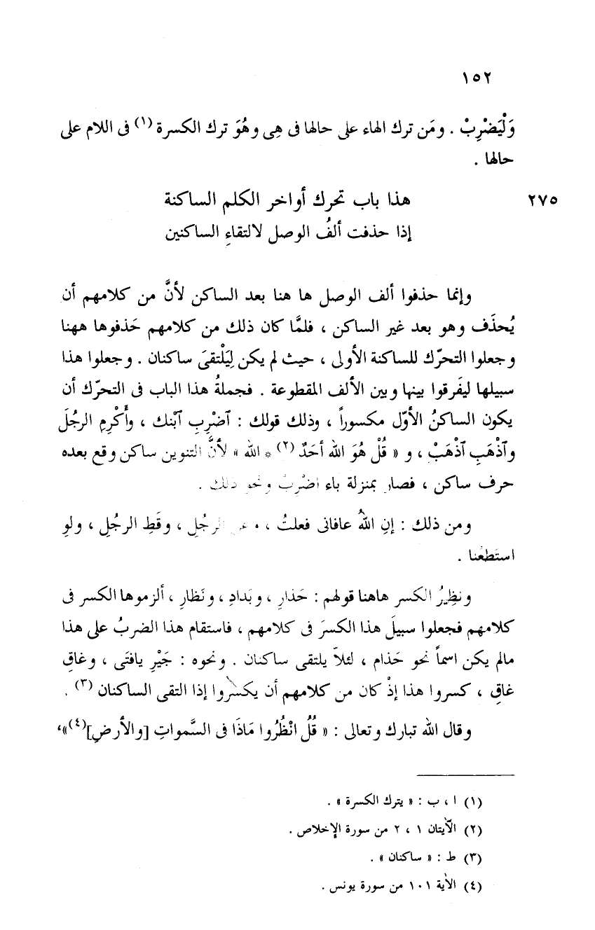 وإنما حذفوا ألف الوصل ها هنا بعد الساكن لأن من كلامهم أن يحذف وهو بعد غير الساكن، فلما كان ذلك من كلامهم حذفوها ههنا وجعلوا التحرك للساكنة الأولى، حيث لم يكن ليلتقي ساكنان. وجعلوا هذا سبيلها ليفرقوا بينها وبين الألف المقطوعة. فجملة هذا الباب في التحرك أن يكون الساكن الأول مكسوراً، وذلك قولك: اضرب ابنك، وأكرم الرجل، واذهب اذهب، و " قل هو الله أحدٌ. الله " لأن التنوين ساكن وقع بعده حرف ساكن، فصار بمنزلة باء اضرب ونحو ذلك.