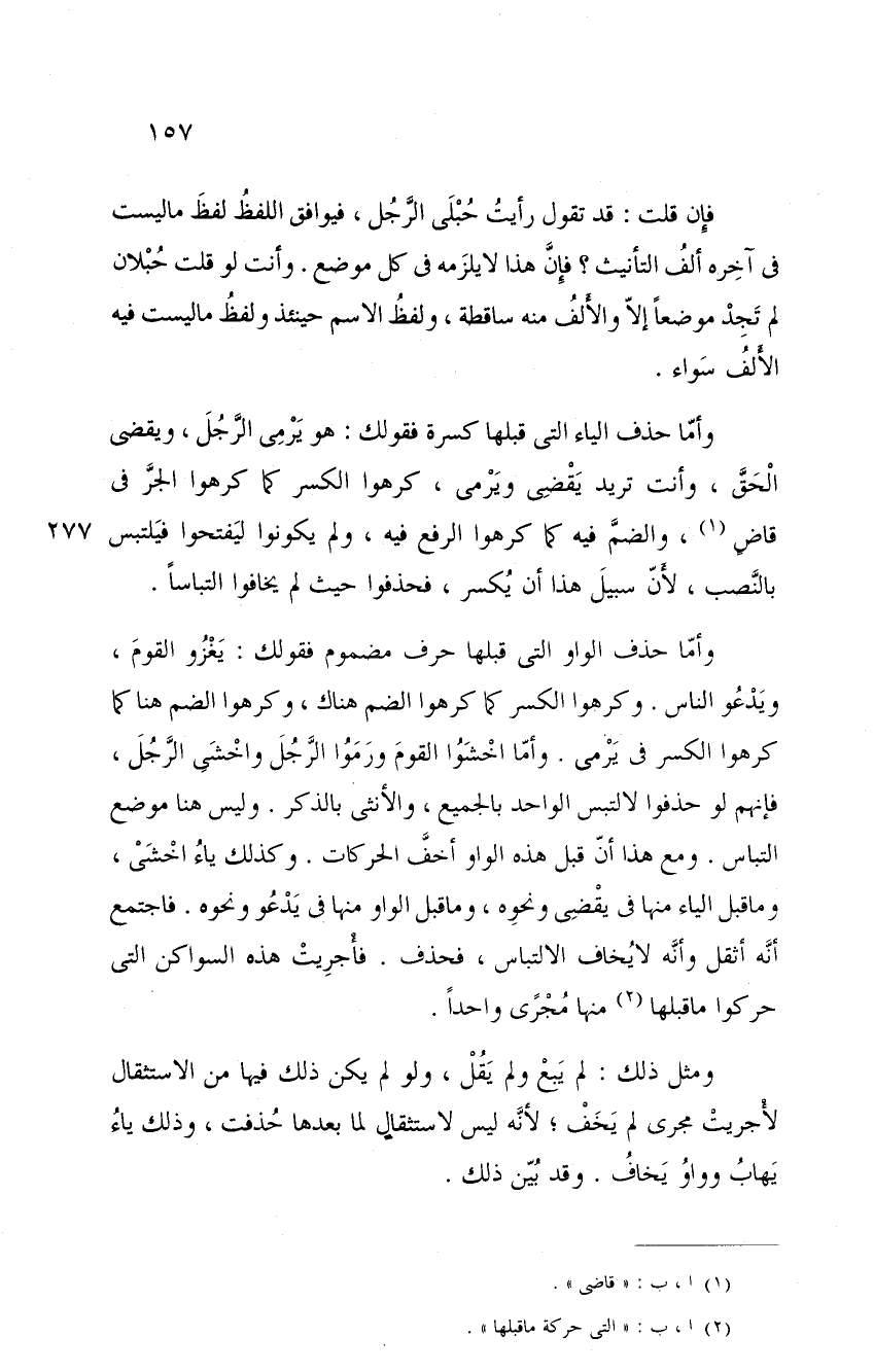 وأما حذف الياء التي قبلها كسرة فقولك: هو يرمي الرجل، ويقضي الحق، وأنت تريد يقضي ويرمي، كرهوا الكسر كما كرهوا الجر في قاضٍ، والضم فيه كما كرهوا الرفع فيه، ولم يكونوا ليفتحوا فيلتبس بالنصب، لأن سبيل هذا أن يكسر، فحذفوا حيث لم يخافوا التباساً.