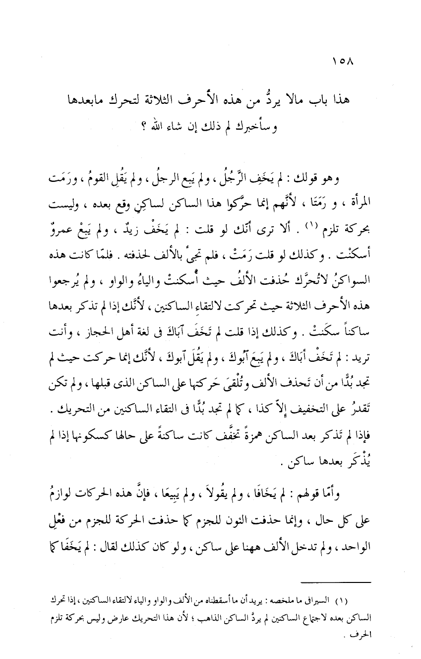 ؟ وسأخبرك لم ذلك إن شاء الله؟ وهو قولك: لم يخف الرجل، ولم يبع الرجل، ولم يقل القوم، ورمت المرأة، ورمتا، لأنهم إنما حركوا هذا الساكن لساكنٍ وقع بعده، وليست بحركة تلزم. ألا ترى أنك لو قلت: لم يخف زيدٌ، ولم يبع عمرٌو أسكنت. وكذلك لو قلت رمت، فلم تجيء بالألف لحذفته. فلما كانت هذه السواكن لا تحرك حذفت الألف حيث أسكنت والياء والواو، ولم يرجعوا هذه الأحرف الثلاثة حيث تحركت لالتقاء الساكنين، لأنك إذا لم تذكر بعدها ساكناً سكنت. وكذلك إذا قلت لم تخلف أباك في لغة أهل الحجاز، وأنت تريد: لم تخف أباك، ولم يبع أبوك، ولم يقل أبوك، لأنك إنما حركت حيث لم تجد بداً من أن تحذف الألف وتلقى حركتها على الساكن الذي قبلها، ولم تكن تقدر على التخفيف إلا كذا، كما لم تجد بداً في التقاء الساكنين من التحريك. فإذا لم تذكر بعد الساكن همزةً تخفف كانت ساكنةً على حالها كسكونها إذا لم يذكر بعدها ساكن.