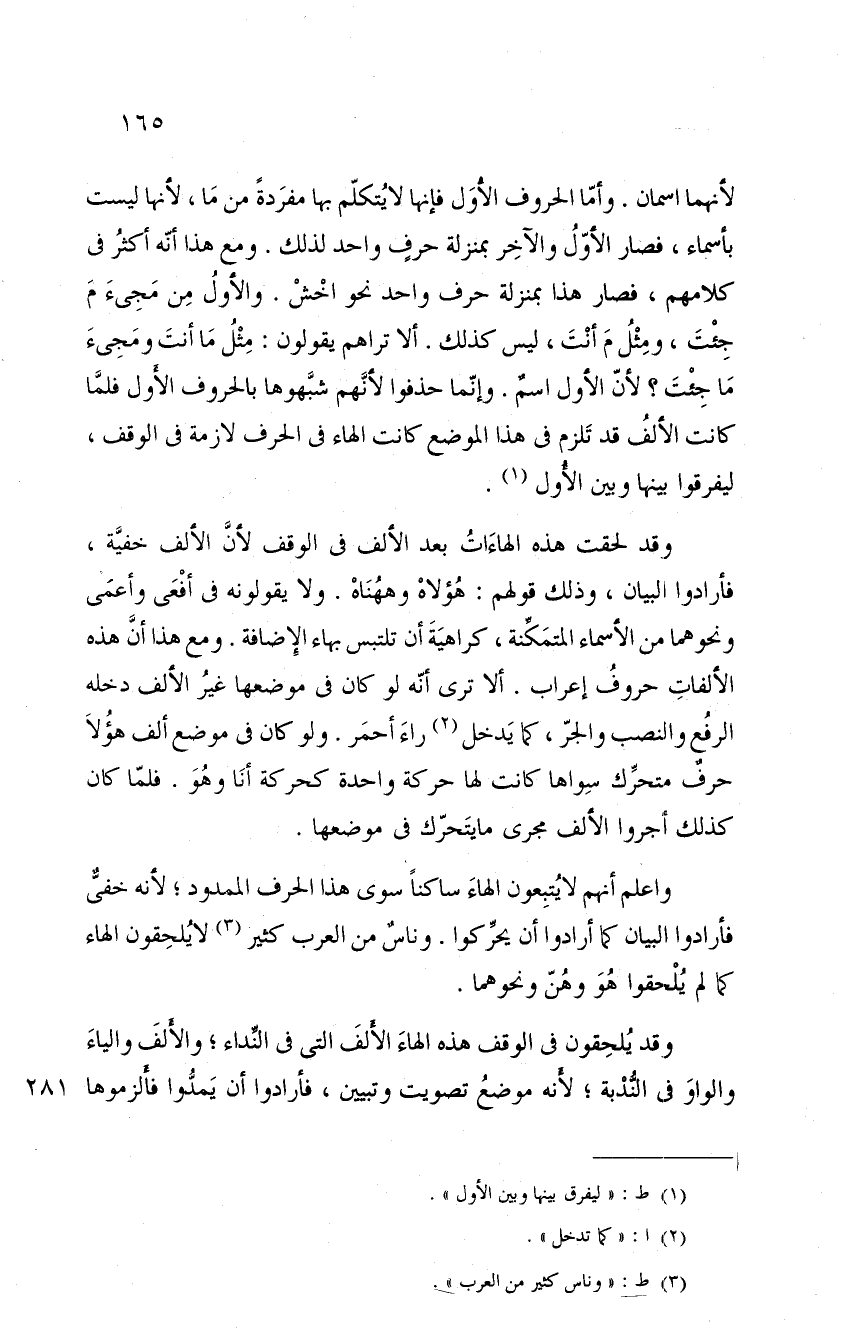 وقد لحقت هذه الهاءات بعد الألف في الوقف لأن الألف خفية، فأرادوا البيان، وذلك قولهم: هؤلاه وههناه. ولا يقولونه في أفعى وأعمى ونحوهما من الأسماء المتمكنة، كراهية أن تلتبس بهاء الإضافة. ومع هذا أن هذه الألفات حروف إعراب. ألا ترى أنه لو كان في موضعها غير الألف دخله الرفع والنصب والجر، كما يدخل راء أحمر. ولو كان في موضع ألف هؤلا حرفٌ متحرك سواها كانت لها حركة واحدة كحركة أنا وهو. فلما كان كذلك أجروا الألف مجرى ما يتحرك في موضعها.