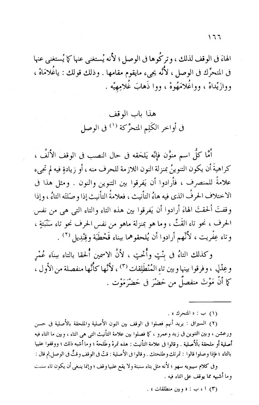 أما كل اسم منون فإنه يلحقه في حال النصب في الوقف الألف، كراهية أن يكون التنوين بمنزلة النون اللازمة للحرف منه أو زيادةٍ فيه لم تجيء علامةً للمنصرف، فأرادوا أن يفرقوا بين التنوين والنون. ومثل هذا في الاختلاف الحرف الذي فيه هاء التأنيث، فعلامة التأنيث إذا وصلته التاء، وإذا وقفت ألحقت الهاء، أرادوا أن يفرقوا بين هذه التاء والتاء التي هي من نفس الحرف، نحو تاء ألقت، وما هو بمنزلة ما هو من نفس الحرف نحو تاء سنبتةٍ، وتاء عفريت، لأنهم أرادوا أن يلحقوهما ببناء قحطبة وقنديل.