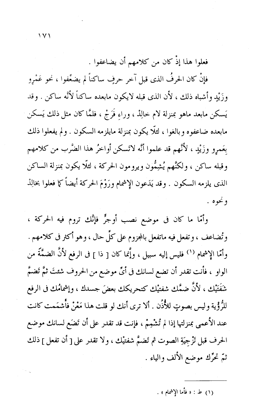 فإن كان الحرف الذي قبل آخر حرفٍ ساكناً لم يضعفوا، نحو عمرٍو وزيدٍ وأشباه ذلك، لأن الذي قبله لا يكون ما بعده ساكناً لأنه ساكن. وقد يسكن ما بعد ما هو بمنزلة لام خالد وراء فرج، فلما كان مثل ذلك يسكن ما بعده ضاعفوه وبالغوا، لئلا يكون بمنزلة ما يلزمه السكون. ولم يفعلوا ذلك بعمرٍو وزيدٍ، لأنهم قد علموا أنه لا تسكن أواخر هذا الضرب من كلامهم وقبله ساكن، ولكنهم يشمون ويرومون الحركة لئلا يكون بمنزلة الساكن الذي يلزمه السكون. وقد يدعون الإشمام وروم الحركة أيضاً كما فعلوا بخالد ونحوه.
