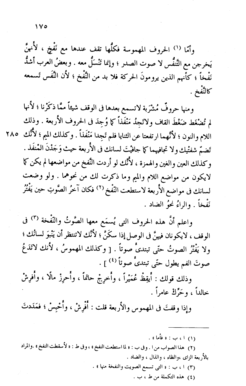 ومنها حروفٌ مشربة لا تسمع بعدها في الوقف شيئاً مما ذكرنا؛ لأنها لم تضغط ضغط القاف ولا تجد منفذاً كما وجد في الحروف الأربعة. وذلك اللام والنون؛ لأنهما ارتفعتا عن الثنايا فلم تجدا منفذاً. وكذلك الميم؛ لأنك تضم شفتيك ولا تجافيهما كما جافيت لسانك في الأربعة حيث وجدن المنفذ. وكذلك العين والغين والهمزة، لأنك لو أردت النفخ من مواضعها لم يكن كما لا يكون من مواضع اللام والميم وما ذكرت لك من نحوهما. ولو وضعت لسانك في مواضع الأربعة لاستطعت النفخ فكان آخر الصوت حين يفتر نفخاً. والراء نحو الضاد.