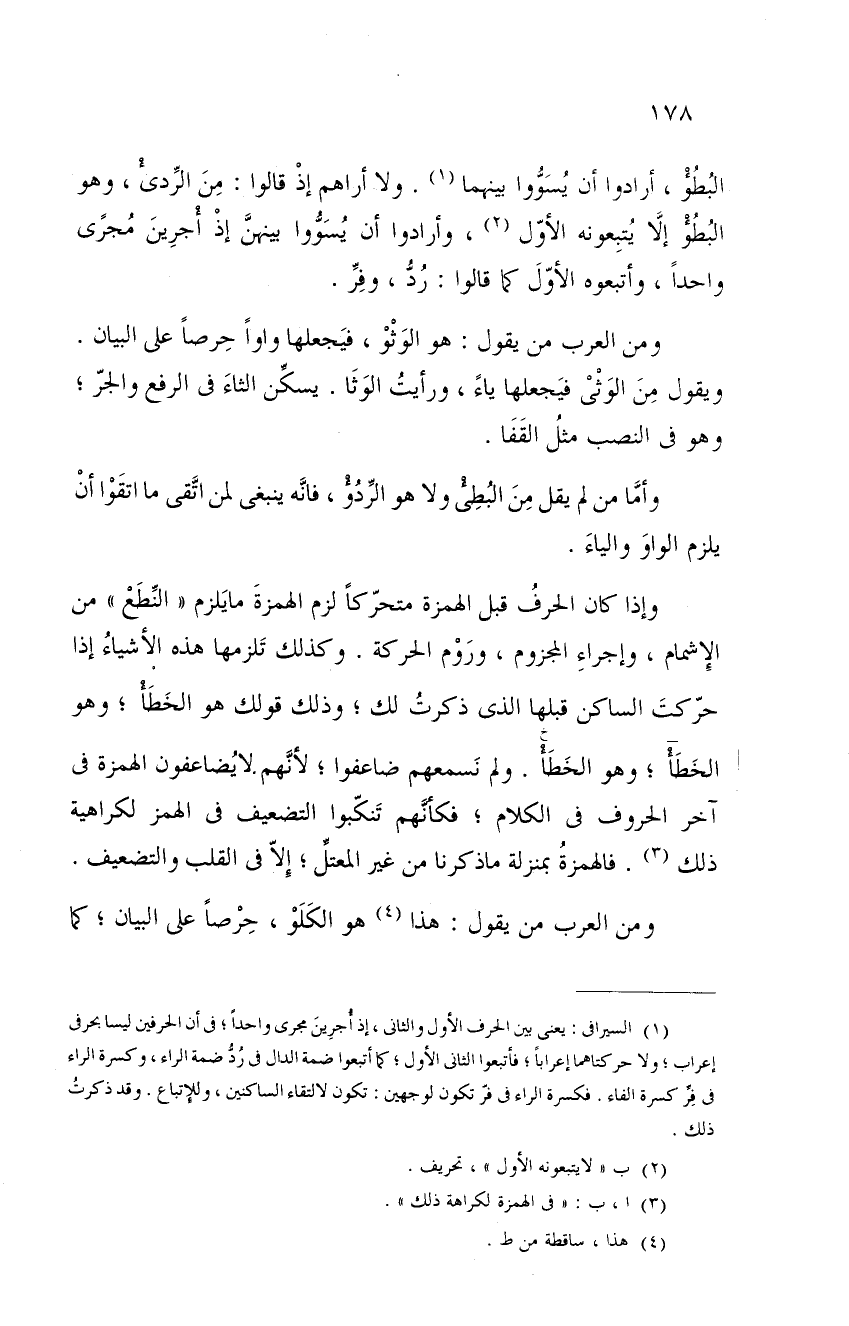 وإذا كان الحرف قبل الهمزة متحركاً لزم الهمزة ما يلزم النطع من الإشمام، وإجراء المجزوم، وروم الحركة. وكذلك تلزمها هذه الأشياء إذا حركت الساكن قبلها الذي ذكرت لك؛ وذلك قولك هو الخطأ؛ وهو الخطأ؛ وهو الخطأ. ولم نسمعهم ضاعفوا؛ لأنهم لا يضاعفون الهمزة في آخر الحروف في الكلام؛ فكأنهم تنكبوا التضعيف في الهمز لكراهية ذلك. فالهمزة بمنزلة ما ذكرنا من غير المعتل؛ إلا في القلب والتضعيف.
