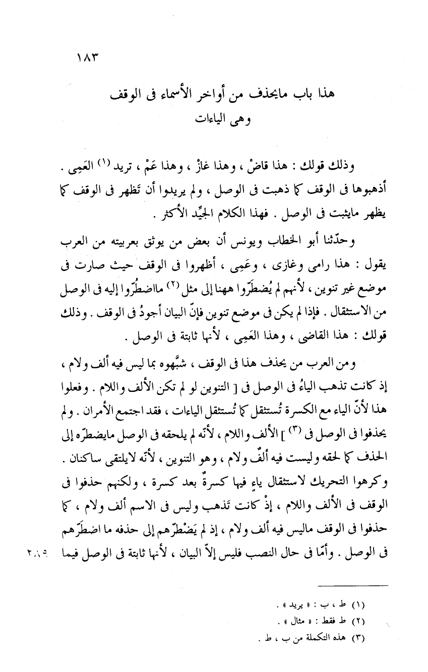 وحدثنا أبو الخطاب ويونس أن بعض من يوثق بعربيته من العرب يقول: هذا رامي وغازي وعمي، أظهروا في الوقف حيث صارت في موضع غير تنوين، لأنهم لم يضطروا ههنا إلى مثل ما اضطروا إليه في الوصل من الاستثقال. فإذا لم يكن في موضع تنوين فإن البيان أجود في الوقف. وذلك قولك: هذا القاضي، وهذا العمي، لأنها ثابتة في الوصل.