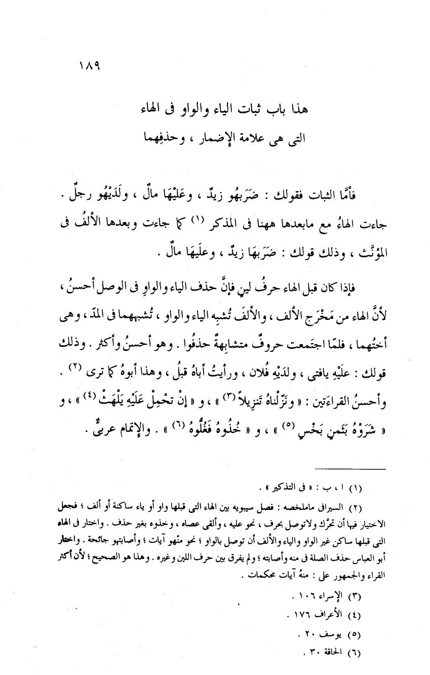 فإذا كان قبل الهاء حرف لينٍ فإن حذف الياء والواو في الوصل أحسن، لأن الهاء من مخرج الألف، والألف تشبه الياء والواو، تشبههما في المد، وهي أختهما، فلما اجتمعت حروفٌ متشابهةٌ حذفوا. وهو أحسن وأكثر. وذلك قولك: عليه يا فتى، ولديه فلان، ورأيت أباه قبل، وهذا أبوه كما ترى. وأحسن القراءتين: " ونزلناه تنزيلا "، و " إن تحمل عليه يلهث "، و " شروه بثمنٍ بخسٍ "، و " خذوه فغلوه ". والإتمام عربيٌّ.
