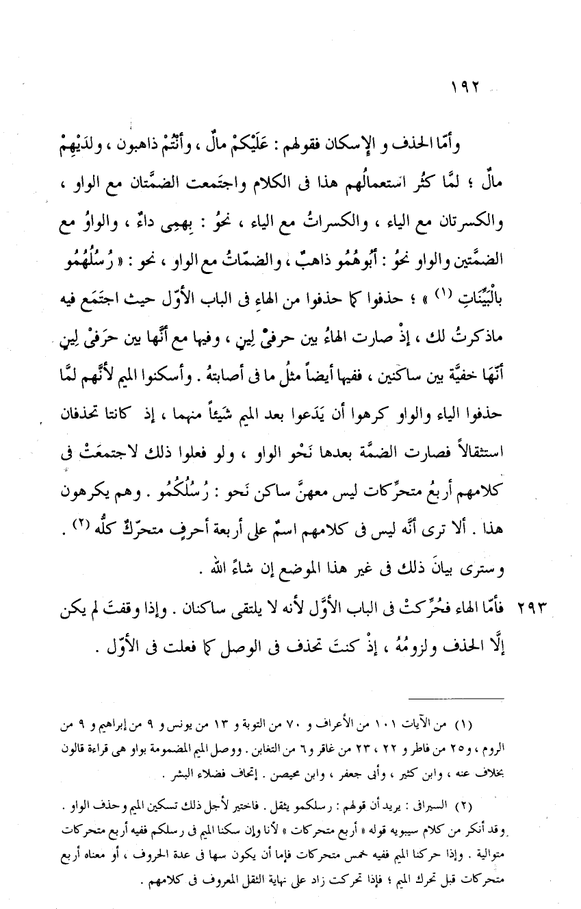 وأما الحذف والإسكان فقولهم: عليكم مالٌ، وأنتم ذاهبون، ولديهم مالٌ؛ لما كثر استعمالهم هذا في الكلام واجتمعت الضمتان مع الواو، والكسرتان مع الياء، والكسرات مع الياء، نحو بهمي داءٌ، والواو مع الضمتين والواو نحو أبوهمو ذاهبٌ، والضمات مع الواو، نحو: " رسلهمو بالبينات "؛ حذفوا كما حذفوا من الهاء في الباب الأول حيث اجتمع فيه ما ذكرت لك، إذ صارت الهاء بين حرفي لينٍ، وفيها مع أنها بين حرفي لينٍ أنها خفية بين ساكنين، ففيها أيضاً مثل ما في أصابته. وأسكنوا الميم لأنهم لما حذفو الياء والواو كرهوا أن يدعوا بعد الميم شيئاً منهما، إذ كانتا تحذفان استثقالاً فصارت الضمة بعدها نحو الواو، ولو فعلوا ذلك لاجتمعت في كلامهم أربع متحركات ليس معهن ساكن نحو: رسلكمو. وهم يكرهون هذا. ألا ترى أنه ليس في كلامهم اسمٌ على أربعة أحرفٌ متحركٌ كله. وسترى بيان ذلك في غير هذا الموضع إن شاء الله.