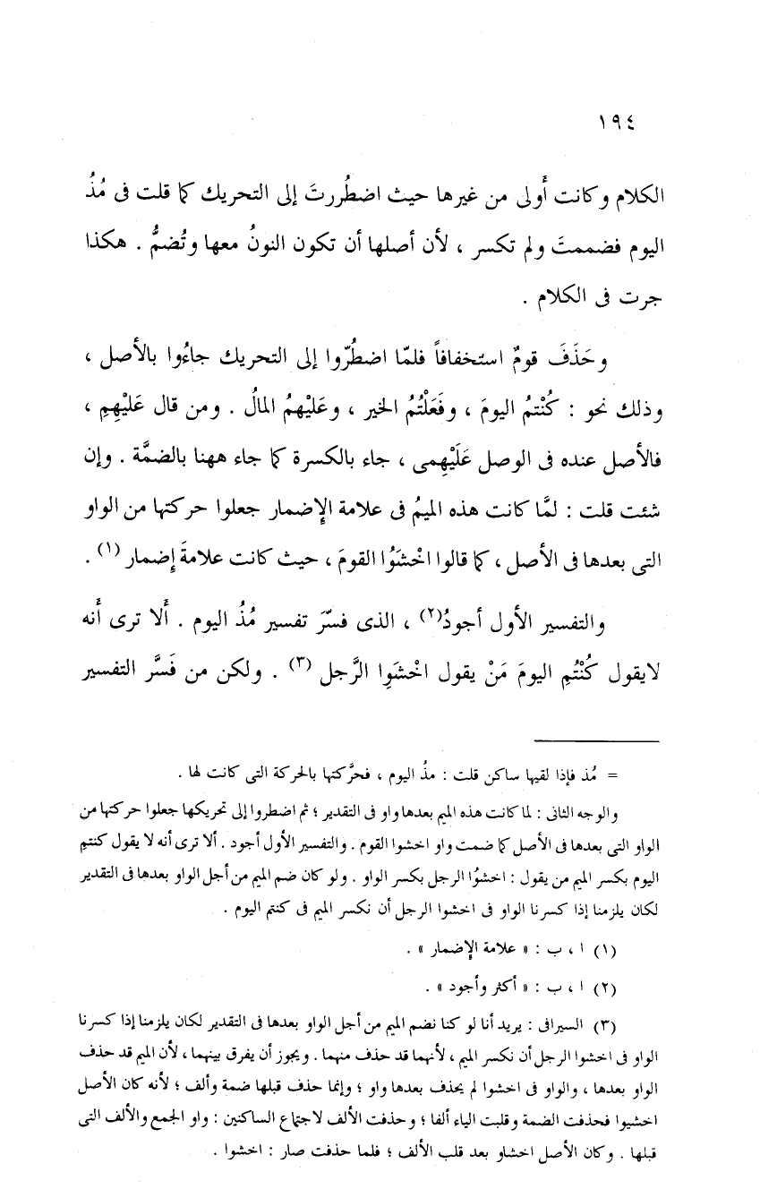 وحذف قومٌ استخفافاً فلما اضطروا إلى التحريك جاءوا بالأصل، وذلك نحو: كنتم اليوم، وفعلتم الخير، وعليهم المال. ومن قال عليهم، فالأصل عنده في الوصل عليهمي، جاء بالكسرة كما جاء ههنا بالضمة. وإن شئت قلت: لما كانت هذه الميم في علامة الإضمار جعلوا حركتها من الواو التي بعدها في الأصل، كما قالوا اخشوا القوم، حيث كانت علامة إضمار.