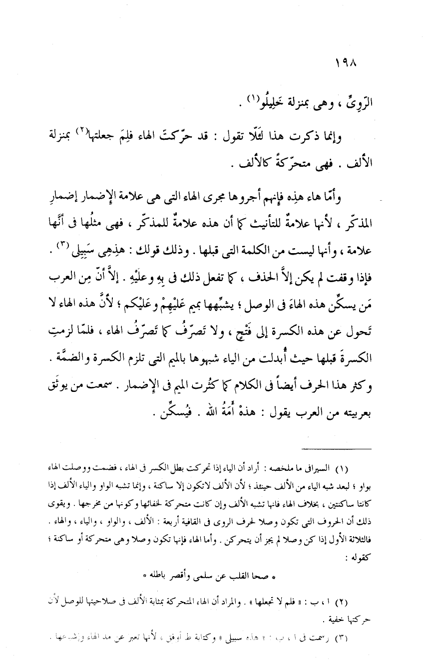 وأما هاء هذه فإنهم أجروها مجرى الهاء التي هي علامة الإضمار إضمار المذكر، لأنها علامةٌ للتأنيث كما أن هذه علامةٌ للمذكر، فهي مثلها في أنها علامة، وأنها ليست من الكلمة التي قبلها. وذلك قولك: هذهي سبيلي. فإذا وقفت لم يكن إلا الحذف، كما تفعل ذلك في به وعليه. إلا أن من العرب من يسكن هذه الهاء في الوصل؛ يشبهها بميم عليهم وعليكم؛ لأن هذه الهاء لا تحول عن هذه الكسرة إلى فتحٍ؛ ولا تصرف كا تصرف الهاء، فلما لزمت الكسرة قبلها حيث أبدلت من الياء شبهوها بالميم التي تلزم الكسرة والضمة. وكثر هذا الحرف أيضاً في الكلام كما كثرت الميم في الإضمار. سمعت من يوثق بعربيته من العرب يقول: هذه أمة الله. فيسكن.