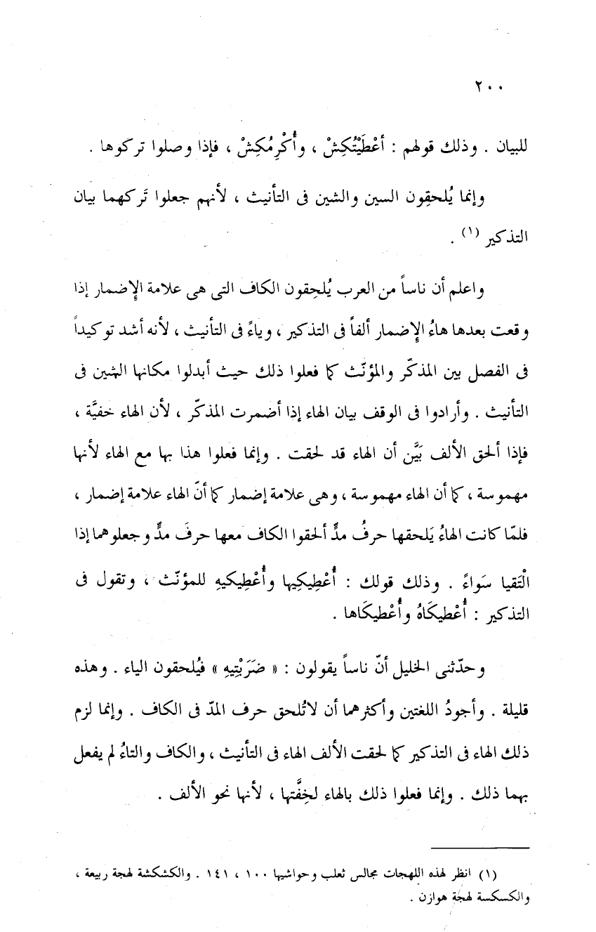 واعلم أن ناساً من العرب يلحقون الكاف التي هي علامة الإضمار إذا وقعت بعدها هاء الإضمار ألفاً في التذكير، وياءً في التأنيث، لأنه أشد توكيداً في الفصل بين المذكر والمؤنث كما فعلوا ذلك حيث أبدلوا مكانها الشين في التأنيث. وأرادوا في الوقف بيان الهاء إذا أضمرت المذكر، لأن الهاء خفية، فإذا ألحق الألف بين أن الهاء قد لحقت. وإنما فعلوا هذا بها مع الهاء لأنها مهموسة، كما أن الهاء قد لحقت. وإنما فعلوا هذا بها مع الهاء لأنها مهموسة، كما أن الهاء مهموسة، وهي علامة إضمار كما أن الهاء علامة إضمار، فلما كانت الهاء يلحقها حرف مدٍّ ألحقوا الكاف معها حرف مدٍّ وجعلوهما إذا التقيا سواءً. وذلك قولك: أعطيكها وأعطيكيه للمؤنث، وتقول في التذكير: أعطيكاه وأعطيكاها.