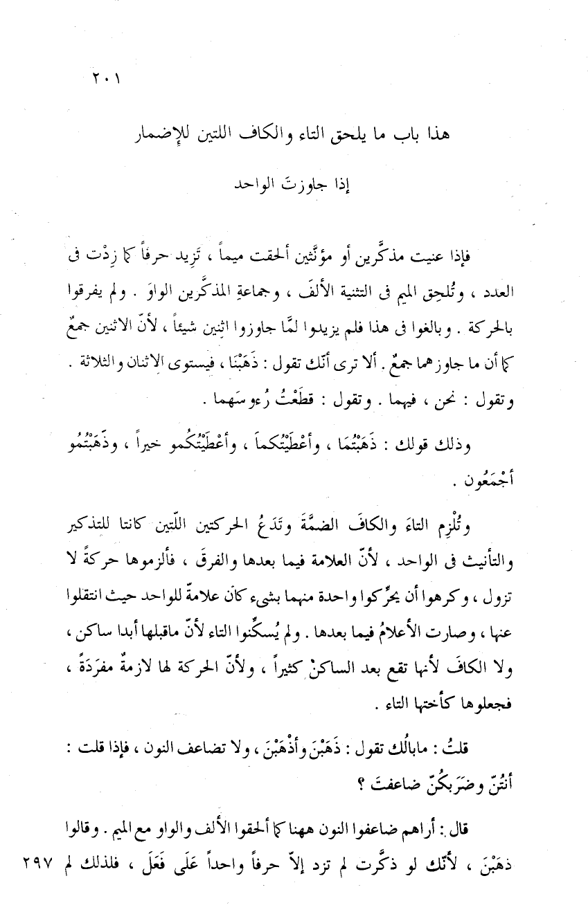 وتلزم التاء والكاف الضمة وتدع الحركتين اللتين كانتا للتذكير والتأنيث في الواحد، لأن العلامة فيما بعدها والفرق، فألزموها حركة لا تزول وكرهوا أن يحركوا واحدة منهما بشيء كان علامة للواحد حيث انتقلوا عنها، وصارت الأعلام فيما بعدها. ولم يسكنوا التاء لأن ما قبلها أبداً ساكن، ولا الكاف لأنها تقع بعد الساكن كثيراً، ولأن الحركة لها لازمةٌ مفردة، فجعلوها كأختها التاء.