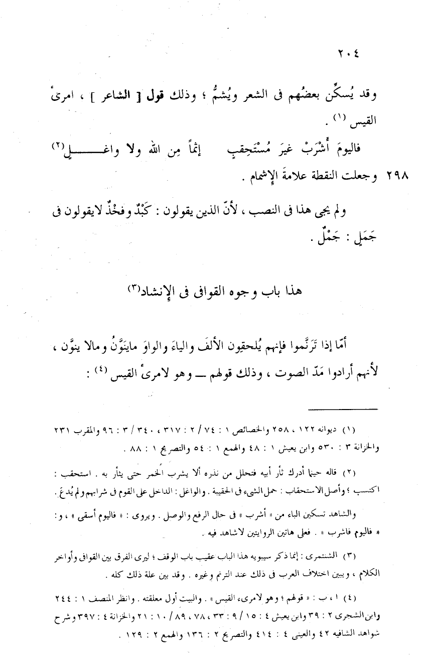 أما إذا ترنموا فإنهم يلحقون الألف والياء والواو ما ينون وما لا ينون، لأنهم أرادوا مد الصوت، وذلك قولهم - وهو لامرىء القيس: