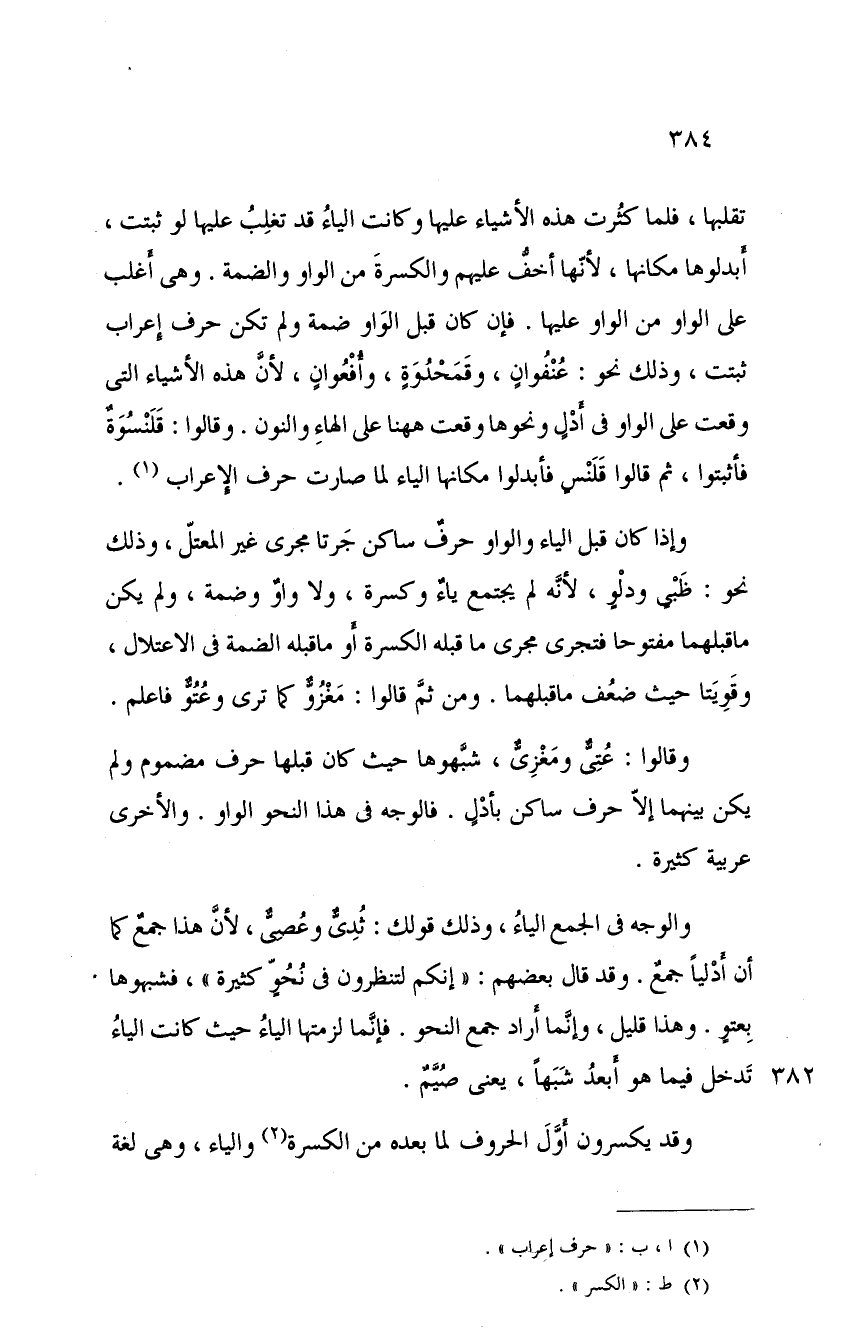 تقلبها، فلما كثرت هذه الأشياء عليها وكانت الياء قد تغلب عليها لو ثبتت، أبدلوها مكانها، لأنها أخف عليهم والكسرة من الواو والضمة. وهي أغلب على الواو من الواو عليها. فإن كان قبل الواو ضمة ولم تكن حرف إعراب ثبتت، وذلك نحو: عنفوانٍ، وقمحدوةٍ، وأفعوانٍ، لأن هذه الأشياء التي وقعت على الواو في أدلٍ ونحوها وقعت ههنا على الهاء والنون. وقالوا: قلنسوةٌ فأثبتوا، ثم قالوا قلنسٍ فأبدلوا مكانها الياء لما صارت حرف الإعراب.