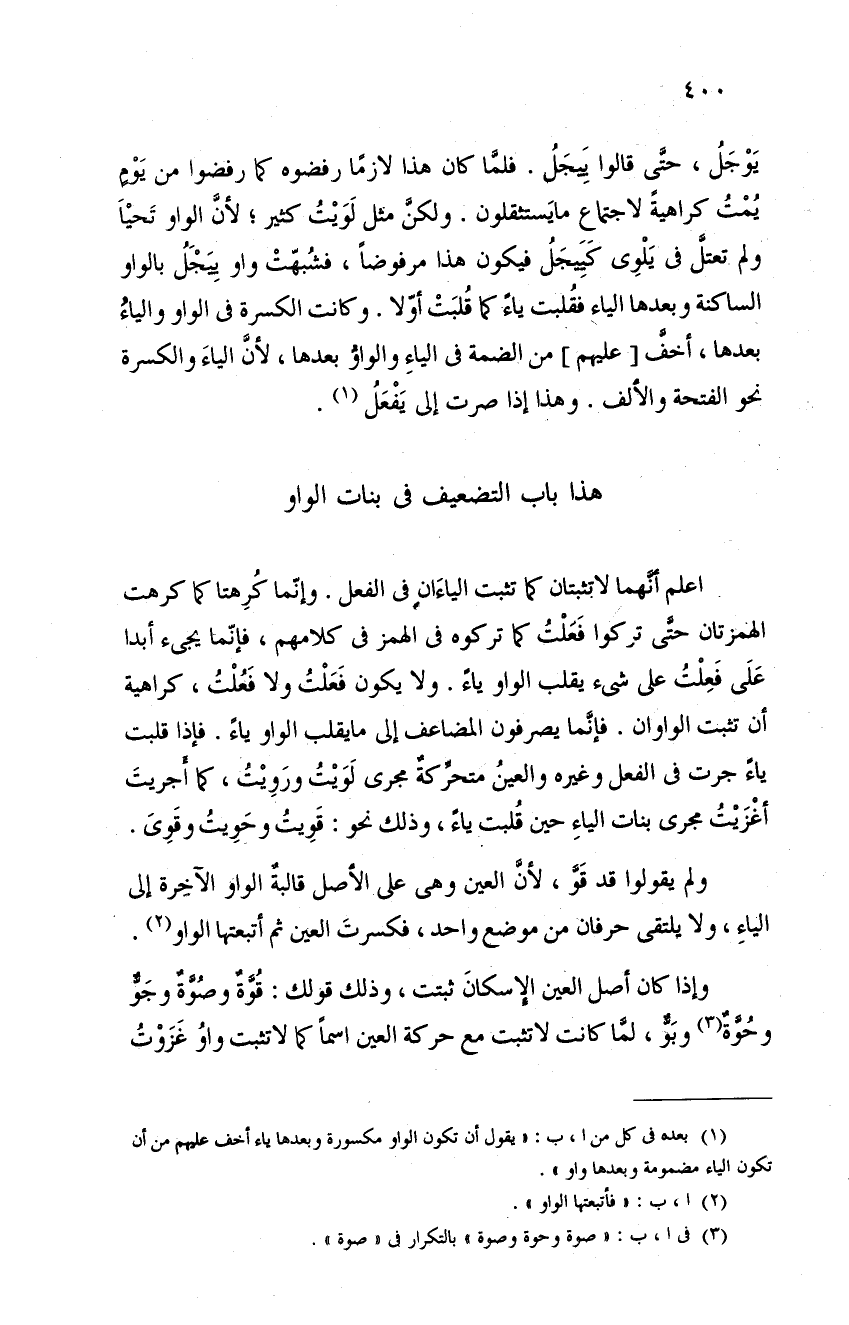 يوجل، حتى قالوا ييجل. فلما كان هذا لازماً رفضوه كما رفضوا من يومٍ يمت كراهية لاجتماع ما يستثقلون. ولكن مثل لويت كثير لأن الواو تحيا ولم تعتل في يلوي كييجل فيكون هذا مرفوضاً، فشبهت واو ييجل بالواو الساكنة وبعدها الياء فقلبت ياءً كما قلبت أولا. وكانت الكسرة في الواو والياء بعدها، أخف عليهم من الضمة في الياء والواو بعدها، لأن الياء والكسرة نحو الفتحة والألف. وهذا إذا صرت إلى يفعل.