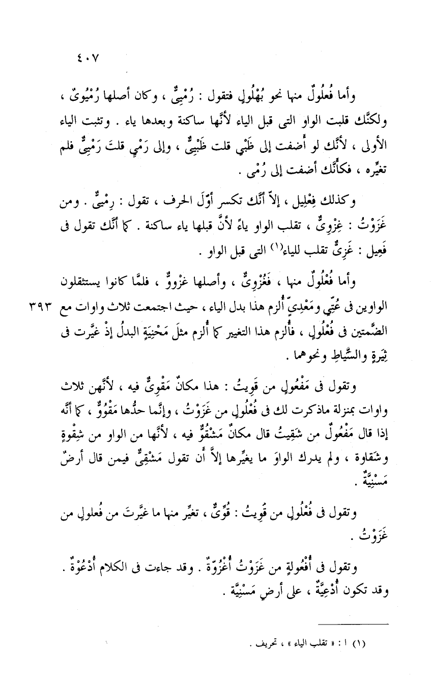 وأما فعلولٌ منها، فغزويٌّ، وأصلها غزووٍّ، فلما كانوا يستثقلون الواوين في عتيٍ ومعديٍ ألزم هذا بدل الياء، حيث اجتمعت ثلاث واوات مع الضمتين في فعلولٍ، فألزم هذا التغيير كما ألزم مثل محنيةٍ البدل إذ غيرت في ثيرةٍ والسياط ونحوهما.
