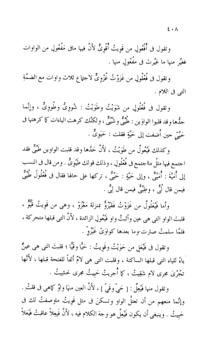 وتقول في فعلولٍ من شويت وطويت: شوويٌ وطووىٌّ، وإنما حدها وقد قلبوا الواوين: طيىٌّ وشيىٌّ، ولكنك كرهت الياءات كما كرهتها في حيىٍ حين أضفت إلى حيةٍ فقلت: حيوىٌّ.