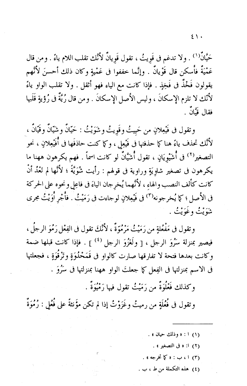 وتقول في فيعلانٍ من حييت وقويت وشويت: حيانٌ وشيانٌ وقيانٌ، لأنك تحذف ياءً هنا كما حذفتها في فيعلٍ، وكما كنت حاذفها في أفيعلانٍ، نحو التصغير في أشيويانٍ، تقول أشيانٌ لو كانت اسماً. فهم يكرهون ههنا ما يكرهون في تصغير شاويةٍ وراويةٍ في قولهم: رأيت شويةً لأنها لم تعد أن كانت كألف النصب والهاء، لأنهما يخرجان الياء في فاعلٍ ونحوه على الحركة في الأصل؛ كما يخرجونه في فيعلانٍ لو جاءت في رميت. فأجر أويت مجرى شويت وغويت.