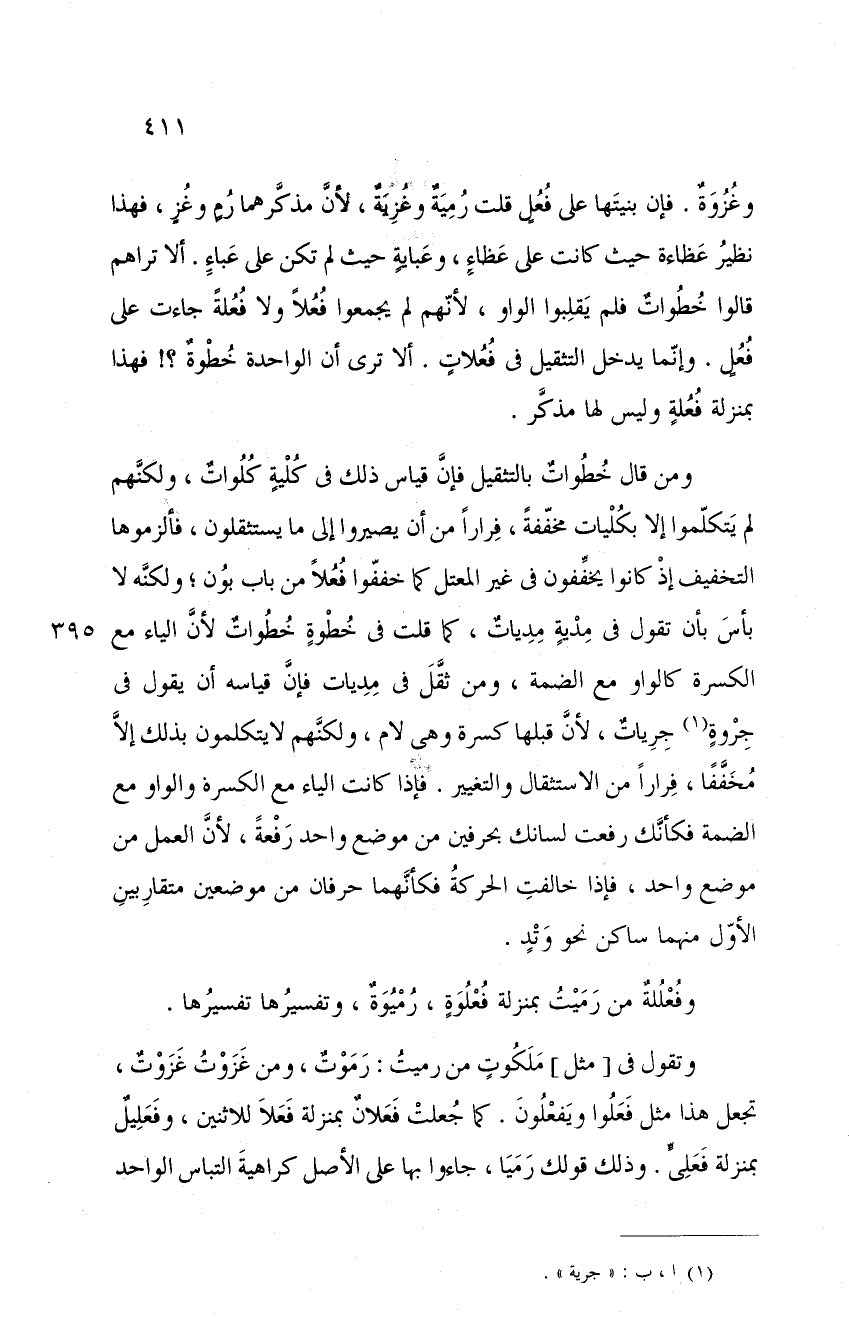 وغزوةٌ. فإن بنيتها على فعلٍ قلت رميةٌ وغزيةٌ، لأن مذكرهما رمٍ وغزٍ، فهذا نظير عظاءة حيث كانت على عظاءٍ، وعبايةٍ حيث لم تكن على عباءٍ. ألا تراهم قالوا خطواتٌ فلم يقلبوا الواو، لأنهم لم يجمعوا فعلاً ولا فعلةً جاءت على فعلٍ. وإنما يدخل التثقيل في فعلاتٍ. ألا ترى أن الواحدة خطوةٌ؟! فهذا بمنزلة فعلةٍ وليس لها مذكر.